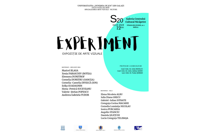 • vor expune 18 artiști, absolvenți și masteranzi ai programului de masterat Arte vizuale - Pictură din cadrul Facultății de Arte a Universității „Dunărea de Jos” • expoziția „Experiment” poate fi vizitată până pe 15 august, de Sfânta Maria Mare