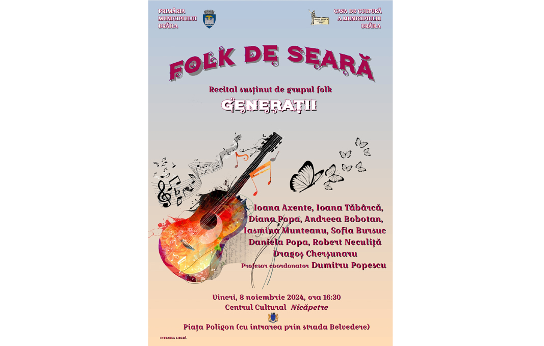 „Creat din dorinţa de a promova şi perpetua muzica folk în rândul publicului brăilean de orice vârstă și având ca motivație principală bucuria de a cânta și de a fi împreună, evenimentul se doreşte a fi o incursiune în tainele muzicii folk, muzică ce a inspirat generaţii întregi. Vor cânta Ioana Axente, Ioana Tăbârcă, Diana Popa, Andreea Bobotan, Iasmina Munteanu, Sofia Bursuc, Daniela Popa, Robert Neculiță și Dragoș Cherșunaru”, precizează managerul Casei de Cultură a Municipiului Brăila, Emanoil Ciucașu.