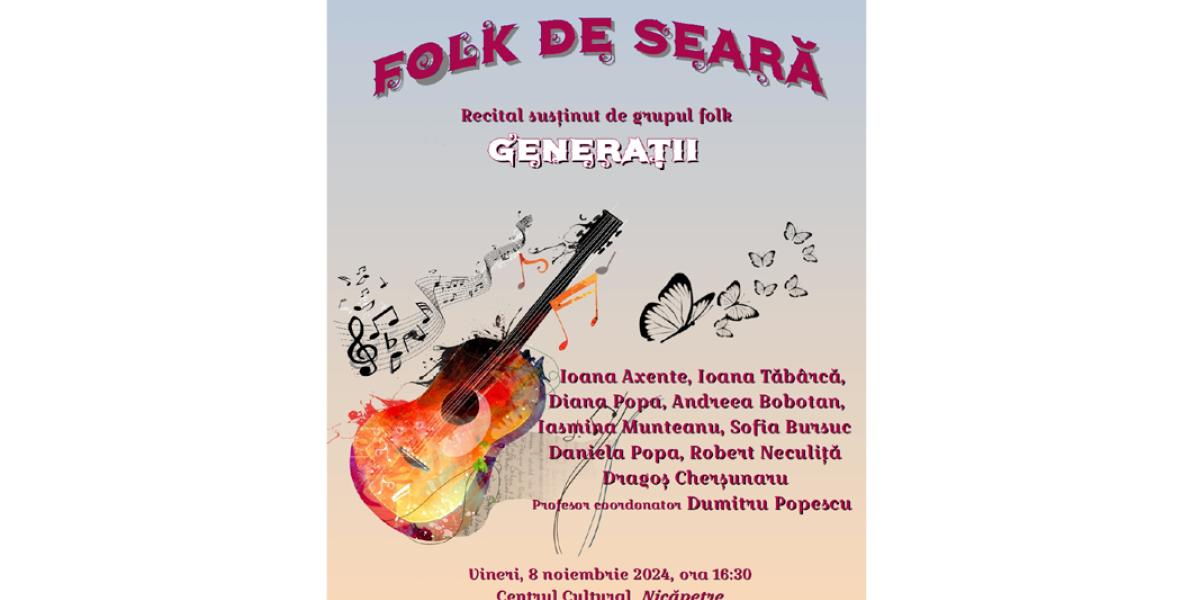 Casa de Cultură a Municipiului Brăila îi invită pe brăileni vineri, 8 noiembrie, de la ora 16:30, la un recital de muzică folk oferit de membrii grupului „Generaţii”. Spectacolul, intitulat „Folk de seară”, va avea loc la Centrul Cultural Nicăpetre, din Piaţa Poligon.