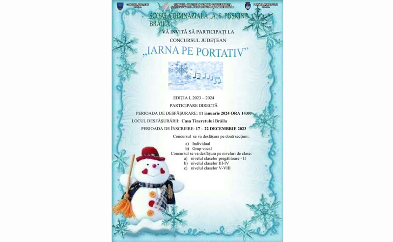 Consiliul Județean Brăila, prin Centrul Județean pentru Conservarea și Promovarea Culturii Tradiționale (Centrul de Creație) și Primăria Municipiului Brăila, în parteneriat cu Școala Gimnazială „A. S. Pușkin”, din municipiu, organizează joi, 11 ianuarie 2024, începând cu ora 14.00, prima ediție a Concursului Județean „Iarna pe portativ”. Evenimentul are loc la Casa Tineretului, de pe Calea Călărașilor, iar intrarea este liberă (în limita locurilor dispnibile), informează organizatorii concursului.