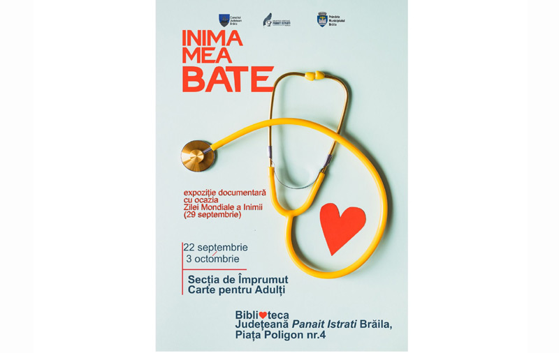 În perioada 22 septembrie - 3 octombrie 2023, Secția Împrumut pentru Adulți din cadrul Bibliotecii Județene ”Panait Istrati” Brăila organizează o expoziție documentară intitulată ”Inima mea bate”. Expoziția este dedicată Zilei Mondiale a Inimii și conține o serie de volume aflate în colecțiile bibliotecii.