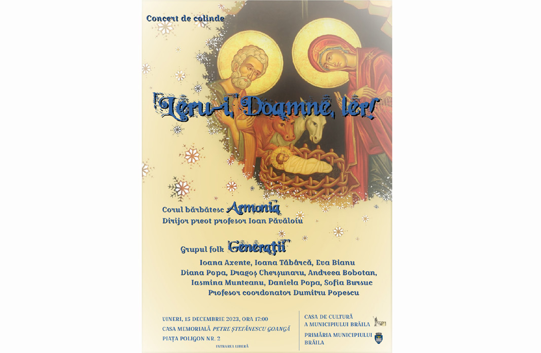 Casa de Cultură a Municipiului Brăila îi invită pe brăilenii de toate vârstele, astăzi, 15 decembrie 2023, de la ora 17.00, la Casa Memorială „Petre Ștefănescu-Goangă”, din Centrul Istoric al municipiului (Piața Poligon nr. 2), pentru a urmări tradiționalul Concert de Crăciun, în așteptarea luminosului praznic al Nașterii Domnului nostru Iisus Hristos.