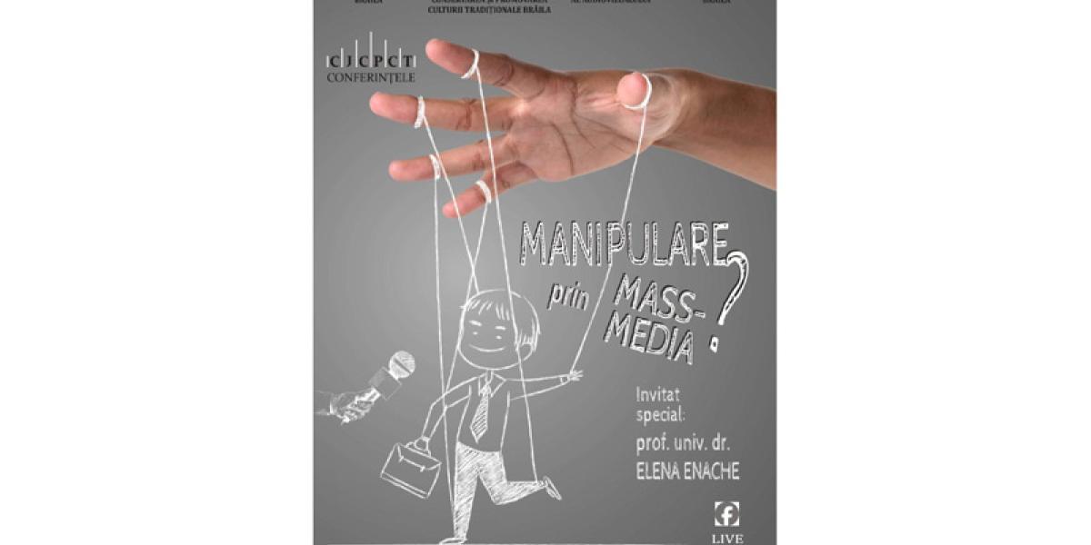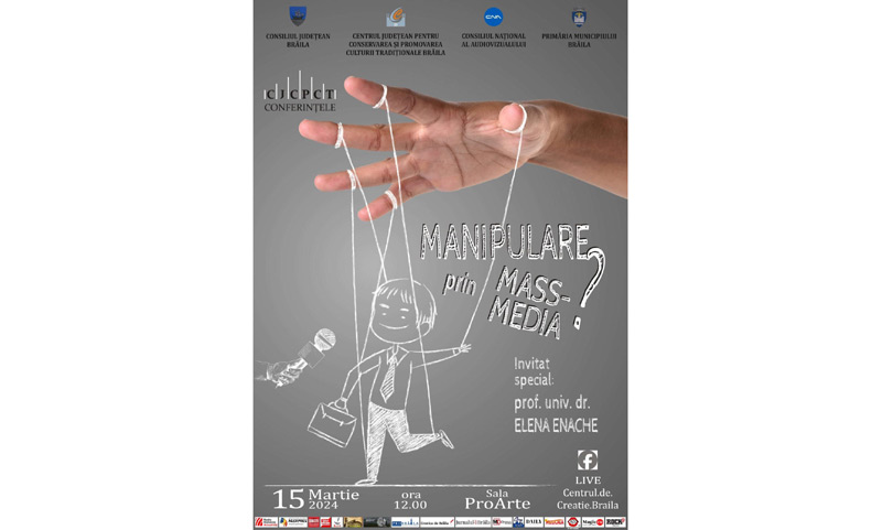 Consiliul Județean Brăila, prin Centrul Județean pentru Conservarea și Promovarea Culturii Tradiționale (Centrul de Creație) și Primăria Municipiului Brăila, în parteneriat cu Consiliul Național al Audiovizualului, organizează vineri, 15 martie 2024, începând cu ora 12.00, Conferința „Manipulare prin mass-media”, „cu scopul de a aduce în lumină o pagină de actualitate nu îndeajuns de cunoscută și cercetată”. Evenimentul va avea loc în Sala ProArte a Centrului de Creație Brăila, din Piața Traian nr. 2.