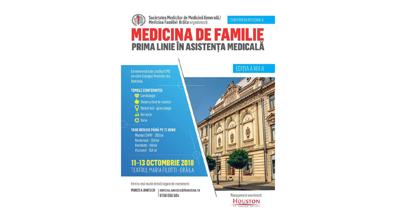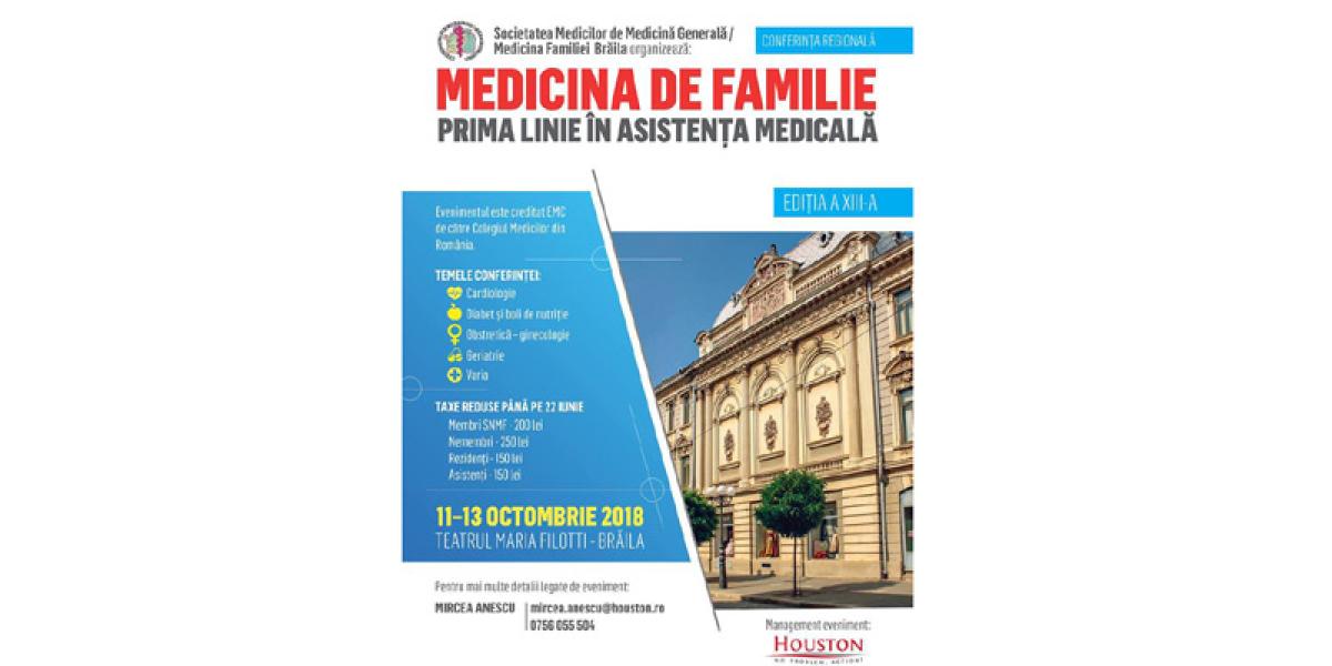 În perioada 11-13 octombrie 2018, la Teatrul „Maria Filotti” din Brăila are loc cea de a Xlll-a conferinţă regională „Medicina de familie – prima linie în asistenţa medicală”. Evenimentul organizat de SOCIETATEA MEDICILOR de MEDICINĂ GENERALĂ / MEDICINA FAMILIEI BRĂILA este dedicat medicilor de familie şi este creditat EMC de către Colegiul Medicilor din România.