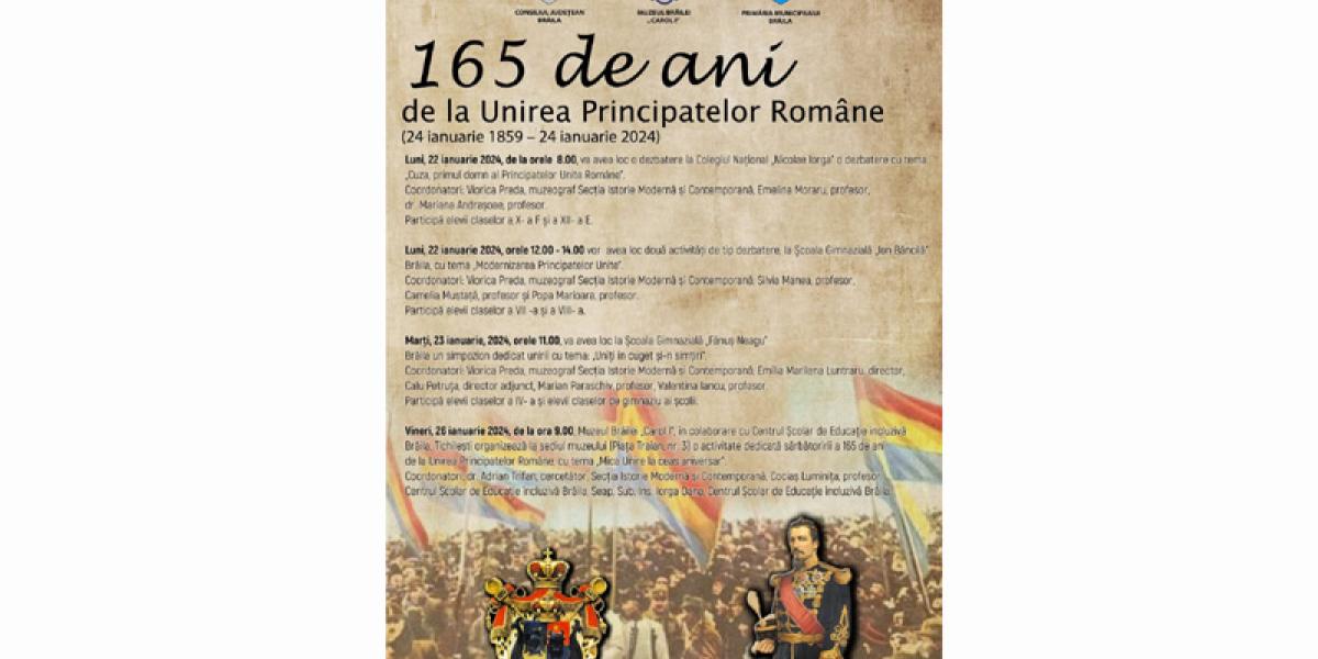 În fine, vineri, 26 ianuarie 2024, de la ora 9.00, Muzeul Brăilei „Carol I”, în colaborare cu Centrul Școlar de Educație Incluzivă Brăila - Tichilești organizează la sediul muzeului (Piața Traian, nr. 3) o activitate dedicată sărbătoririi a 165 de ani de la Unirea Principatelor Române, cu tema „Mica Unire la ceas aniversar”. Coordonatori: dr. Adrian Trifan, cercetător, Secția Istorie Modernă și Contemporană a Muzeului Brăilei „Carol I”, prof. Luminița Cociaș și subinsp. Oana Iorga, Centrul Școlar de Educație Incluzivă Brăila.