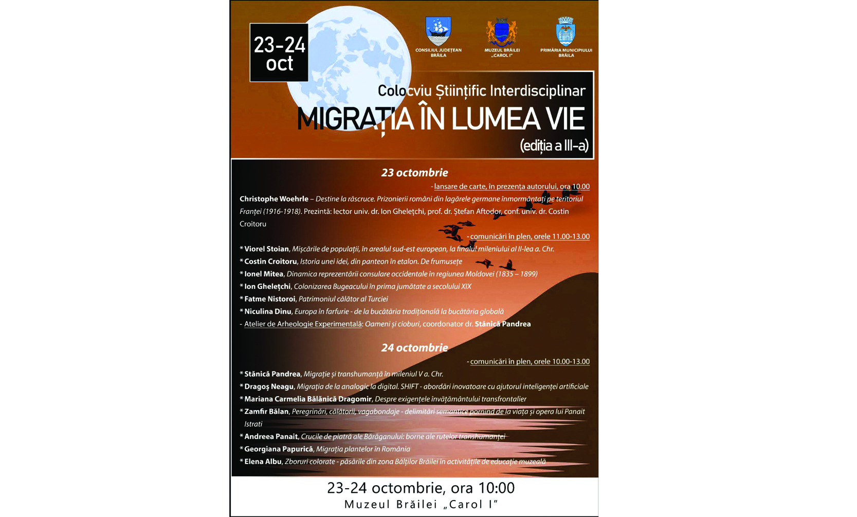 Muzeul Brăilei „Carol I” organizează, în zilele de 23 și 24 octombrie, la sediul din Piața Traian, nr. 3, Sala „Regele Ferdinand I și Regina Maria”, cea de a III-a ediție a Colocviului Științific Interdisciplinar „Migrația în lumea vie”.