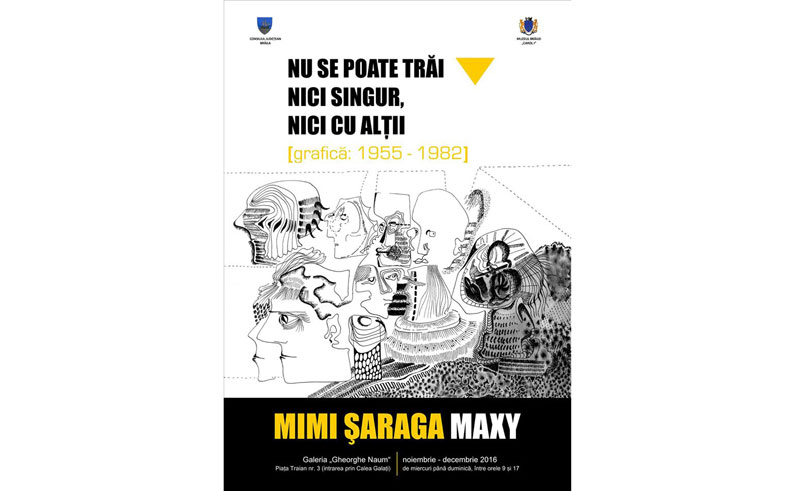 Sâmbătă, 19 noiembrie 2016, ora 12.00, la Galeriile „Gheorghe Naum” are loc vernisajul expoziţiei de grafică „Nu se poate trăi nici singur, nici cu alţii...”, lucrări semnate de Mimi Şaraga Maxy.