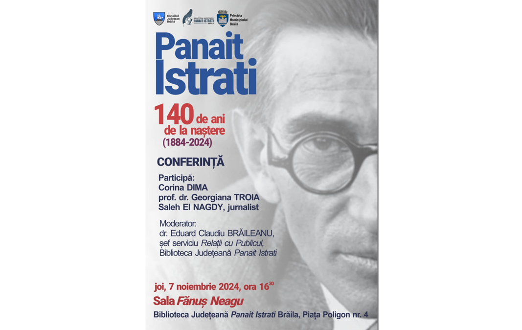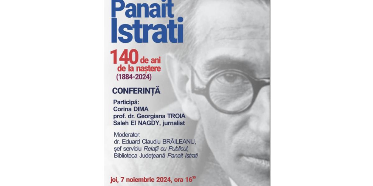 Astfel, Biblioteca Județeană „Panait Istrati” Brăila îi invită pe brăilenii de toate vârstele joi, 7 noiembrie, începând cu ora 16:30, la Conferința „Panait Istrati - 140 de ani de la naștere”. Evenimentul va avea loc în Sala „Fănuș Neagu”, de la etajul 3 al instituției din Piața Poligon.