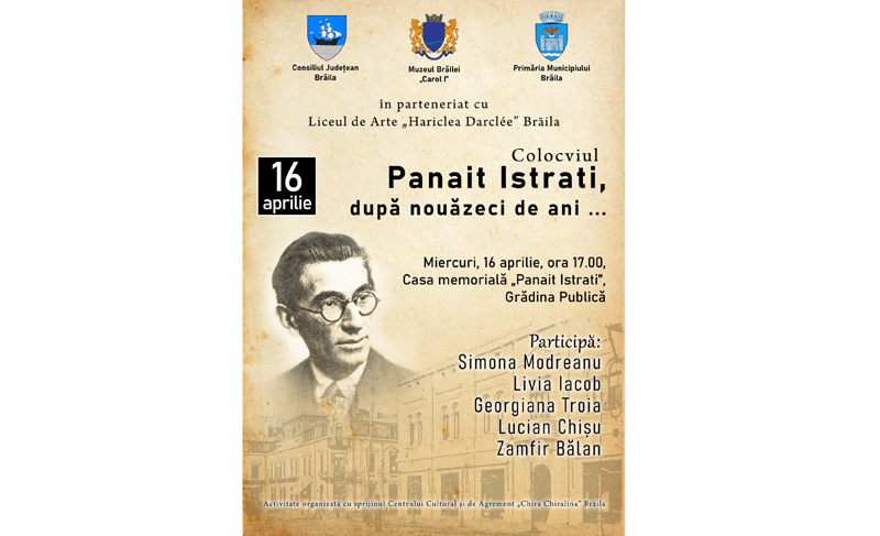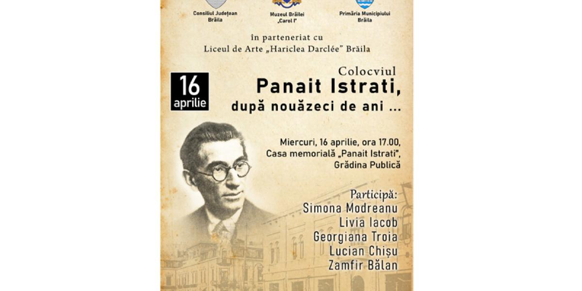 Muzeul Brăilei „Carol I”, Consiliul Județean și Primăria Municipiului Brăila, în parteneriat cu Liceul de Arte „Harclea Darclee”, organizează miercuri, 16 aprilie, începând cu ora 17:00, colocviul „Panait Istrati, după nouăzeci de ani...”. Evenimentul cultural dedicat marelui scriitor va avea loc la Casa Memorială „Panait Istrati”, din Grădina Publică, aparținând Muzeului Brăilei „Carol I”. Vor susține alocuțiuni și vor evoca personalitatea și opera lui Panait Istrati: Simona Modreanu, Livia Iacob, Georgiana Troia, Lucian Chișu și Zamfir Bălan. Evenimentul de miercuri, de la Casa Memorială „Panait Istrati” este organizat cu sprijinul Centrului Cultural și de Agrement „Chira Chiralina” Brăila, coordonat de Emanoil Ciucașu.