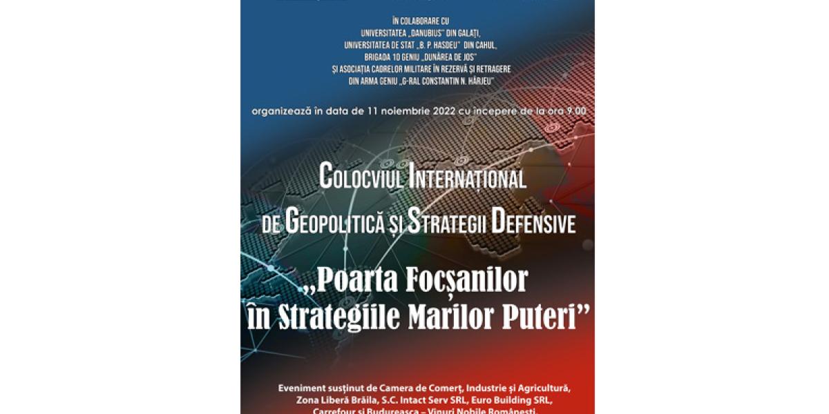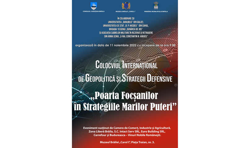 Astfel, potrivit comunicatului instituției, Muzeul Brăilei „Carol I”, Consiliul Județean și Primăria Municipiului Brăila, în colaborare cu Brigada 10 Geniu „Dunărea de Jos” Brăila, Asociația Cadrelor Militare în Rezervă și Retragere din Arma Geniu „General Constantin N. Hârjeu”, Universitatea Danubius Galați și Universitatea de Stat „Bogdan Petriceicu Hașdeu” din Cahul, Republica Moldova, organizează vineri, 11 noiembrie 2022, cu începere de la ora 9.00, la sediul central din Piața Traian nr. 3, Colocviul Internațional de Geopolitică și Strategii Defensive cu tema „Poarta Focșanilor în Strategiile Marilor Puteri”.