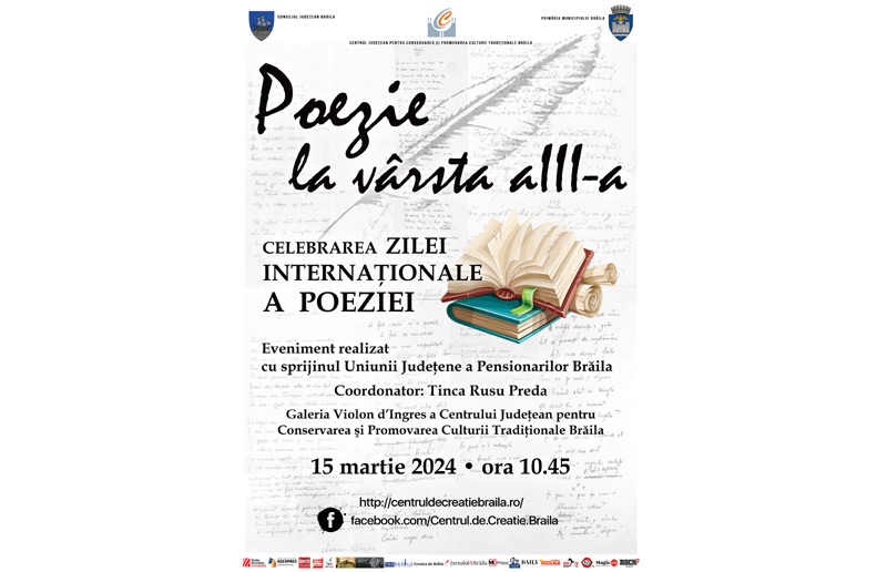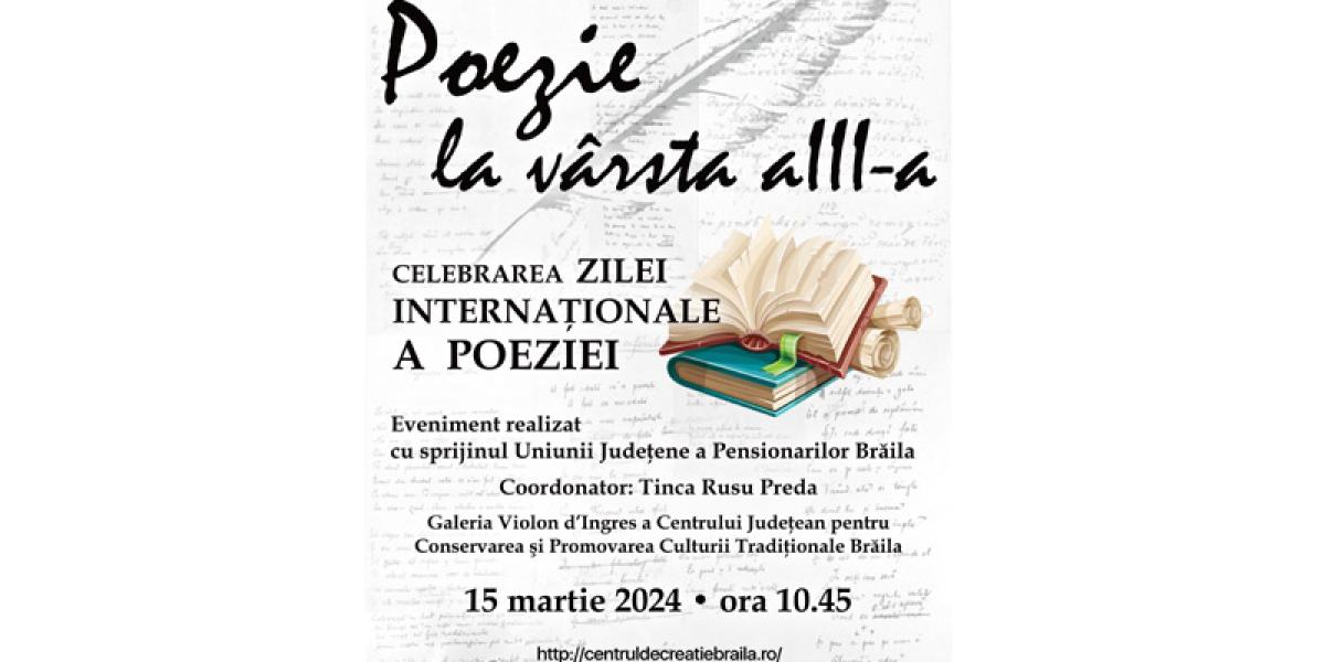 Consiliul Județean Brăila prin Centrul Județean pentru Conservarea și Promovarea Culturii Tradiționale (Centrul de Creație) și Primăria Municipiului Brăila organizează în ziua de vineri, 15 martie, începând cu ora 10.45, activitatea culturală „Poezie la vârsta a III-a, desfășurată sub egida „La o cafea despre Brăila”. Evenimentul este dedicat Zilei Internaționale a Poeziei, sărbătorită an de an, din anul 1999, pe data de 21 martie, „ca o recunoaștere a faptului că oamenii de litere și de cultură, poeții și scriitorii din întreaga lume, și-au adus o contribuție remarcabilă la îmbogățirea culturii și spiritualității universale”.