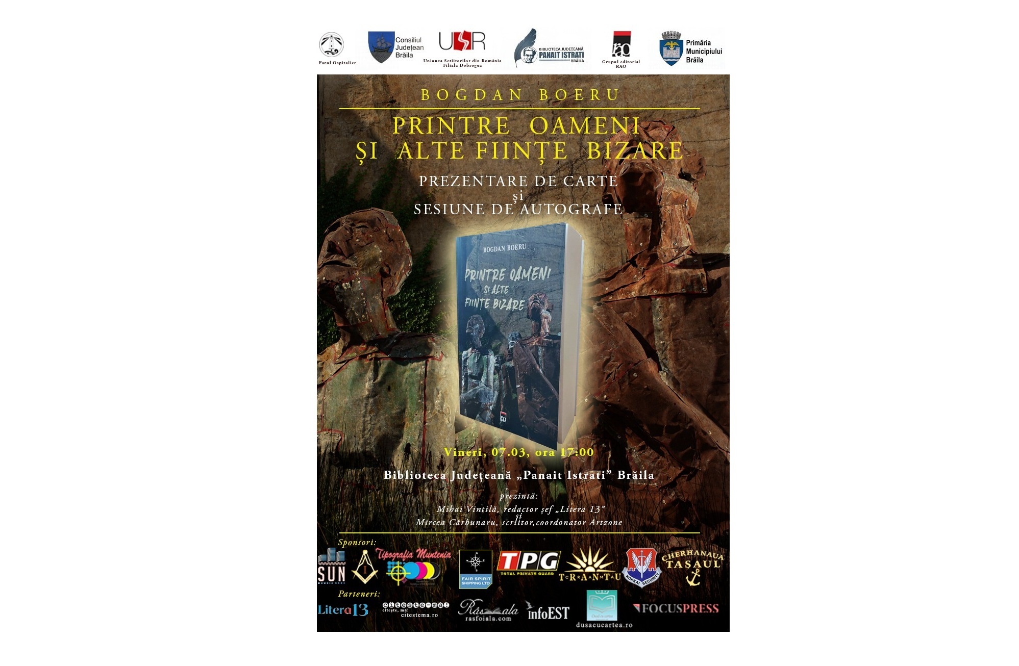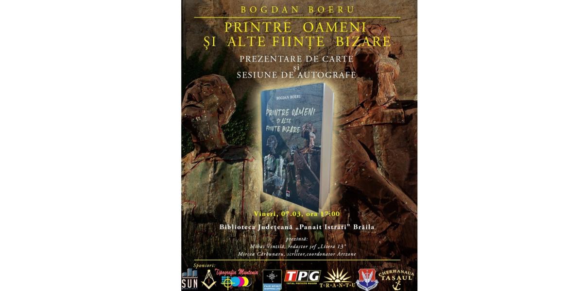 Biblioteca Județeană „Panait Istrati” Brăila îi invită pe iubitorii de lectură vineri, 7 martie, începând cu ora 17.00, la lansarea cărții „Printre oameni și alte ființe bizare”, autor Bogdan Boeru.