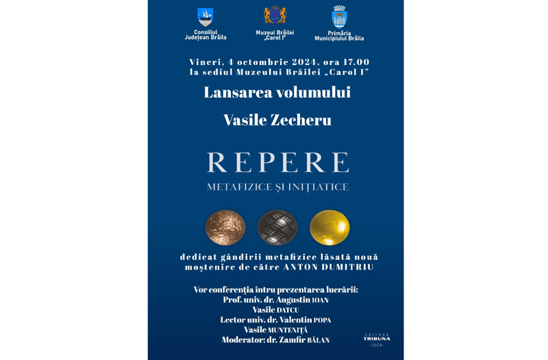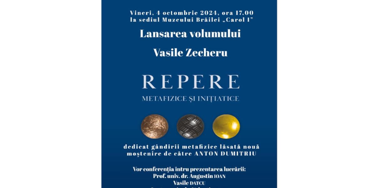 Astfel, vineri, 4 octombrie, începând cu ora 17:00, la sediul central al Muzeului Brăilei „Carol I” - Sala „Regele Ferdinand I și Regina Maria”, din Piața Traian nr. 3, are loc lansarea volumului „Repere metafizice și inițiatice”, de Vasile Zecheru.