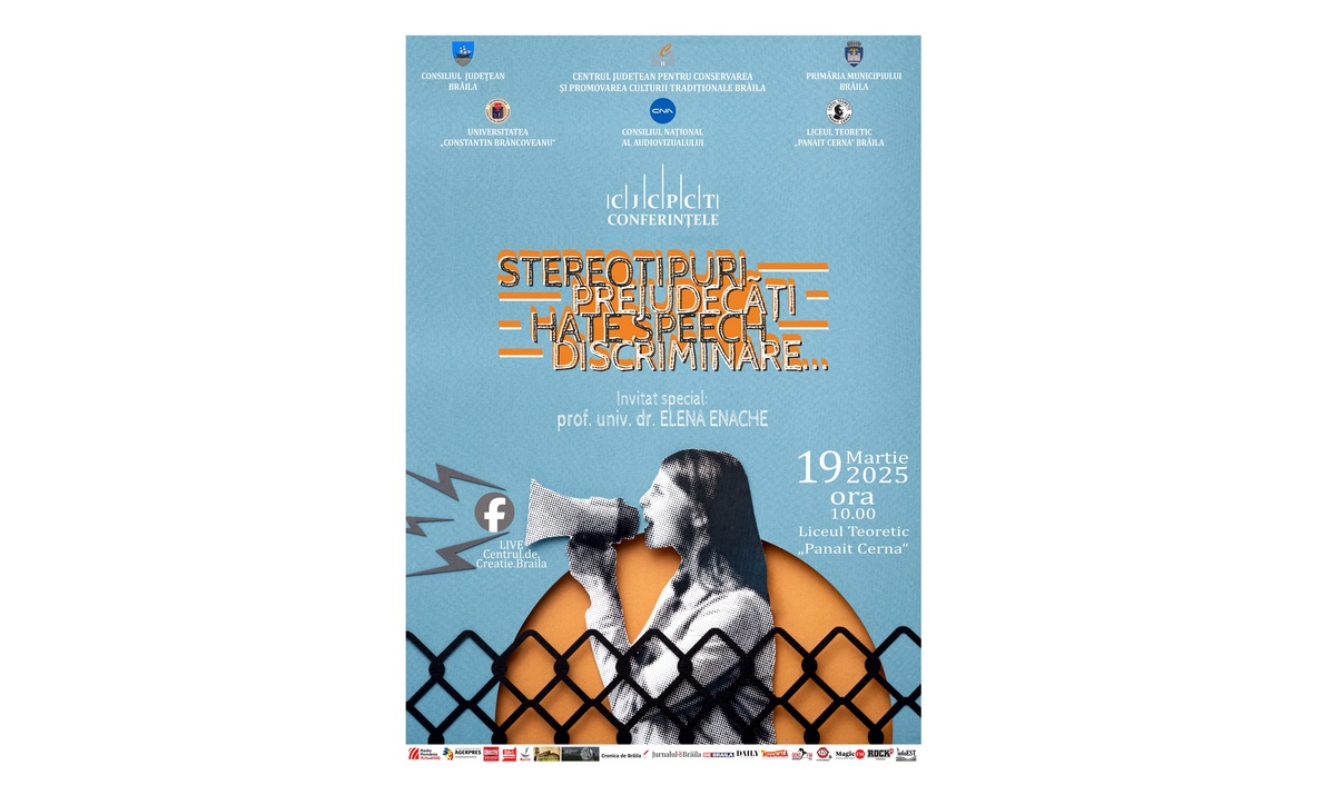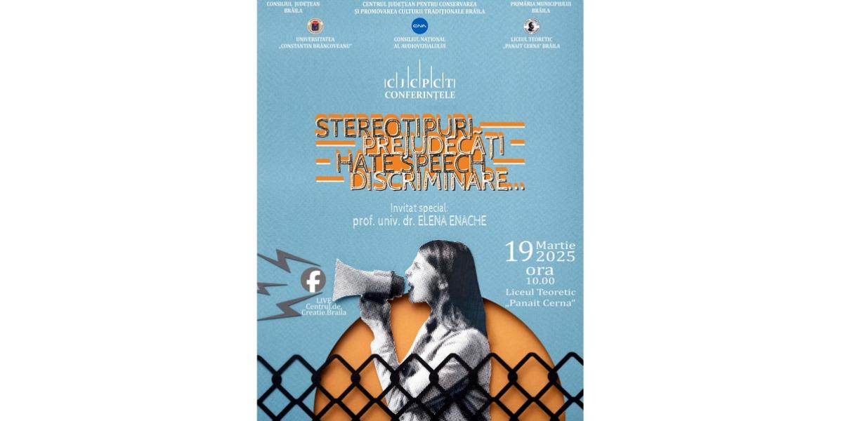 Consiliul Județean Brăila, prin Centrul Județean pentru Conservarea și Promovarea Culturii Tradiționale (CJCPCT) și Primăria Municipiului Brăila, în parteneriat cu Consiliul Național al Audiovizualului, Universitatea „Constantin Brâncoveanu” și Liceul Teoretic „Panait Cerna” Brăila organizează miercuri, 19 martie, începând cu ora 10:00, în incinta unității de învățământ brăilene, Conferința tematică „Stereotipuri, Prejudecăți, Hate speech, Discriminare”.