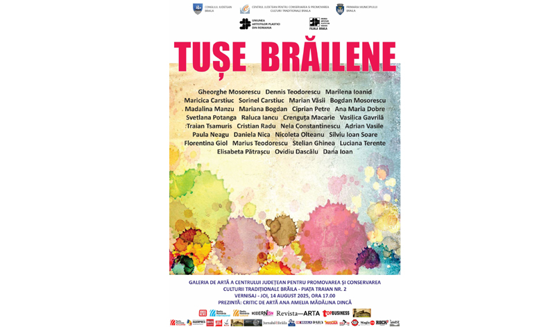 Consiliul Judeţean Brăila, Centrul Judeţean pentru Conservarea şi Promovarea Culturii Tradiţionale, Primăria Municipiului Brăila și Uniunea Artiștilor Plastici din România (UAPR) - Filiala Brăila organizează joi, 14 august, ora 17:00, la Galeria de Artă din Piața Traian nr. 2, vernisajul Expoziției „Tuşe brăilene”.