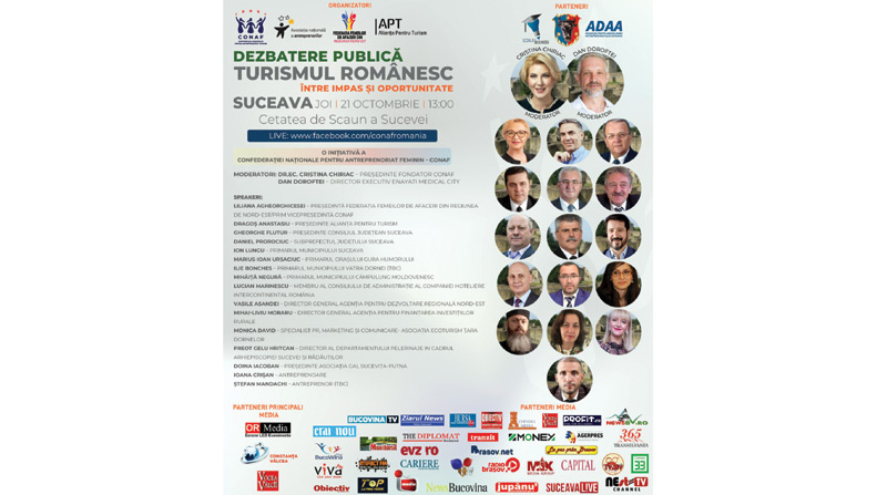 Dezbaterea organizată la Suceava, în Cetatea de Scaun, aduce față în față autoritățile locale cu mediul de afaceri, reprezentanți din domeniul turistic la nivel regional și național, în dorința de a găsi oportunități de creștere și dezvoltare a turismului, în toate formele sale: religios, balnear, istoric, de agrement, ospitalier. Evenimentul va fi moderat de către CRISTINA CHIRIAC, președinta Confederației Naționale pentru Antreprenoriat Feminin și DAN DOROFTEI, director executiv Enayati Medical City.