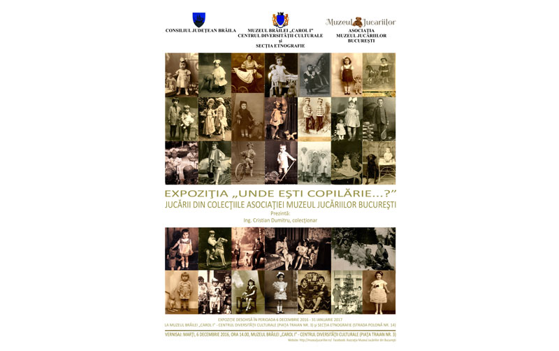 De Ziua Sfântului Mare Ierarh Nicolae, ocrotitorul Brăilei, Muzeul Brăilei „Carol I” - Centrul Diversităţii Culturale şi Secţia Etnografie, împreună cu Asociaţia Muzeul Jucăriilor din Bucureşti organizează vernisajul expoziţiei „Unde eşti, copilărie...?”, în care vor fi expuse jucării din colecţiile Asociaţiei Muzeul Jucăriilor Bucureşti.