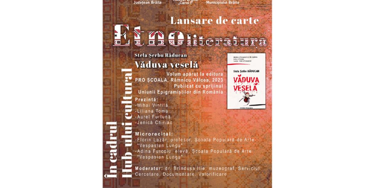 Muzeul Brăilei „Carol I” organizează sâmbătă, 2 noiembrie, ora 17:00, la Casa Alexiu - monument istoric, din Strada Polonă nr. 14 (Colecțiile Etnografice) o nouă întâlnire în cadrul Hub-ului cultural „Etnoliteratura”. Cu acest prilej, va avea loc lansarea volumului „Văduva veselă” - autor brăileanca Stela Șerbu Răducan. Volumul a apărut la Editura PRO ȘCOALA, din Râmnicu Vâlcea, în anul 2023, cu sprijinul Uniunii Epigramiștilor din România, iar acum va ajunge în mâinile iubitorilor de lectură din Brăila.