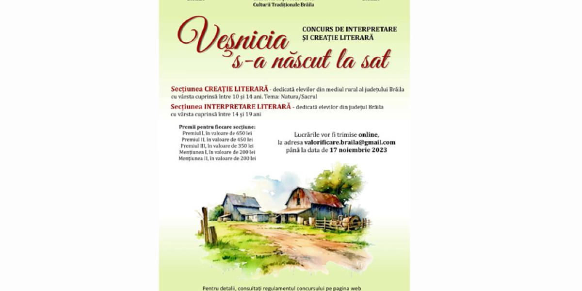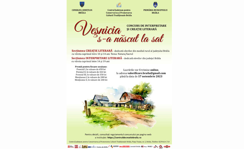 Consiliul Județean Brăila, Primăria Municipiului și Centrul Județean pentru Conservarea și Promovarea Culturii Tradiționale (Centrul de Creație Brăila) Brăila organizează prima ediție a Concursului de interpretare și creație literară destinat elevilor din mediul rural „Veșnicia s-a născut la sat”, având ca temă: SACRUL.