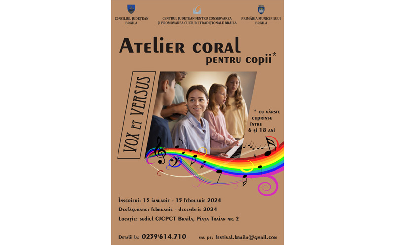„Prin intermediul acestui atelier se propune cultivarea curajului, a răbdării și a reușitei, dar și munca în echipă, fiind o binevenită oportunitate pentru participanți de a se dezvolta armonios prin muzică. Sesiunile Atelierului coral pentru copii „Vox et Versus” se vor desfășura gratuit, pe tot parcursul anului, la sediul Centrului Județean pentru Conservarea și Promovarea Culturii Tradiționale Brăila, din Piața Traian nr. 2 și vor fi coordonate de persoane avizate”, precizează surse din cadrul instituției.