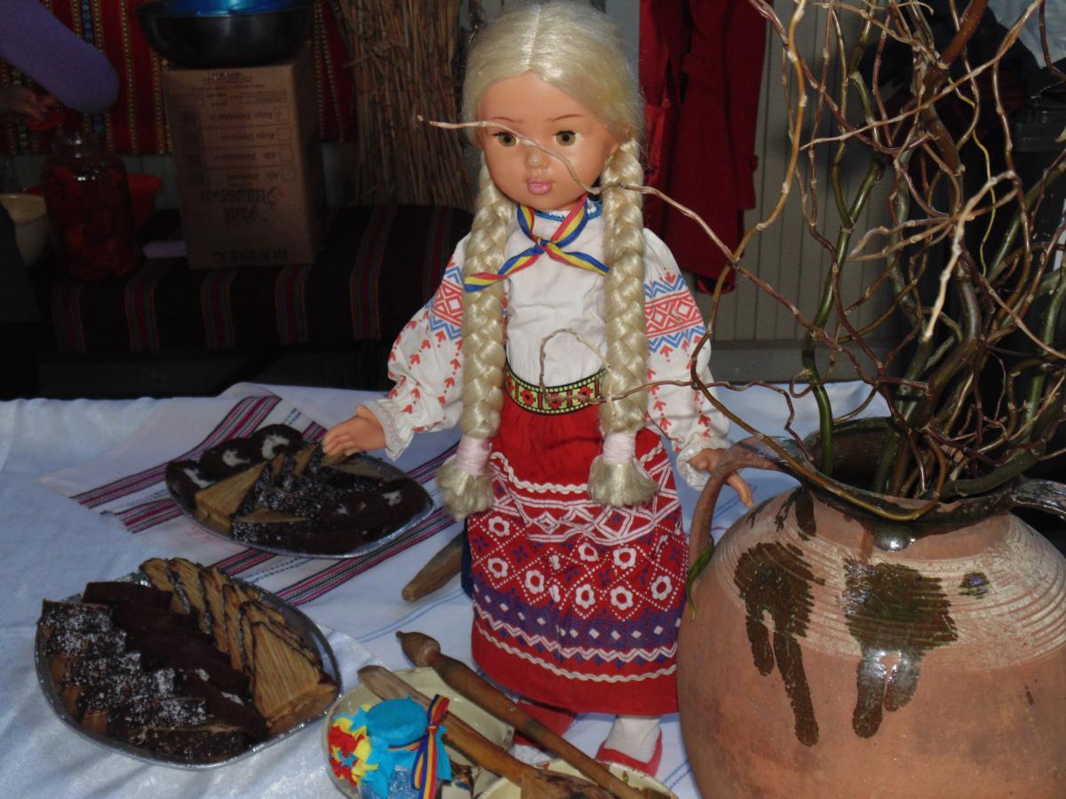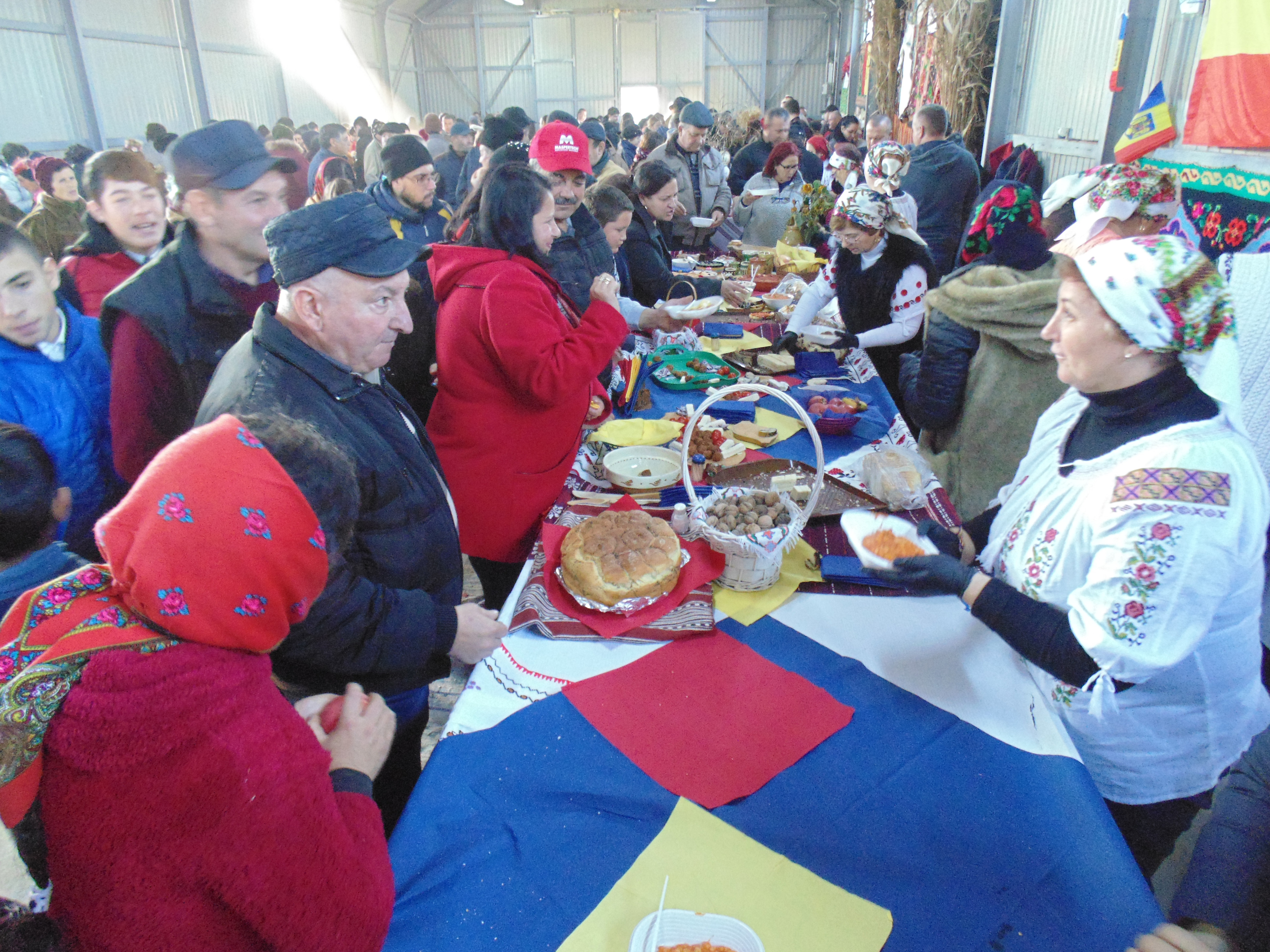 Ştergarele cusute de mână şi carpetele de zeci de ani şi-au găsit locul de cinste în hală, fiecare stand încercând să se apropie cât mai mult de casa ţărănească de odinioară. Iar fiecare echipă a încercat să iasă cu ceva în evidenţă. Spre exemplu, standul Gradiştei de Jos îţi lua ochii cu prăjituri în culori roşu, galben şi albastru. Cinci gospodine au muncit de zor pentru ca preparatele să fie gata până duminică, la ora 11, când începea evenimentul. Liderul echipei formată din cinci gospodine, Geta Andrei, ne-a prezentat standul: “Reprezentăm satul Gradiştea de Jos. Există o tradiţie la noi: concurenţa între sate. Comuna noastră este formată din 4 sate: Gradiştea de Jos, Gradiştea de Sus, Ibrianu şi Maraloiu. Anul acesta, s-a ajuns la concluzia că şi romii, o etnie care reprezintă 20% din comunitate, trebuie să aibă stand. Fiecare sat prezintă produse de post şi produse de dulce. Dulciurile şi aperitivele nu se jurizează. Pe masă avem plăcintă de bostan şi de mere, trandafiraşi de mere de post, guluf de post şi o negresă de post, iar pentru a intra în «febra» zilei de 1 Decembrie, am inventat o negresă acoperită cu cremă de culoare roşie, galbenă şi albastră, spre încântarea ochiului publicului. La aperitive avem coşuleţe umplute cu salată boeuf de post, icre, fasole bătută, salată de vinete, salată de ciuperci cu maioneză de post, pâine de casă, peşte, pentru că este Dezlegare la peşte. Primăria comunei Gradiştea s-a ocupat de aprovizionarea fiecărui stand, la iniţiativa domnului primar. Ieri şi azi am preparat tot ce vedeţi aici. Suntem 5 gospodine. Sperăm că în maxim o oră să se mănânce tot, să nu plecăm cu nimic acasă. Bărbaţii fierb vinul şi ţuica, ca-n fiecare casă ţărănească, fiecare are atribuţiile lui. Ştergarele şi carpele sunt de la noi de acasă. Asta a fost cusută de mâna mea, nu e nouă, are aproape 40 de ani”.