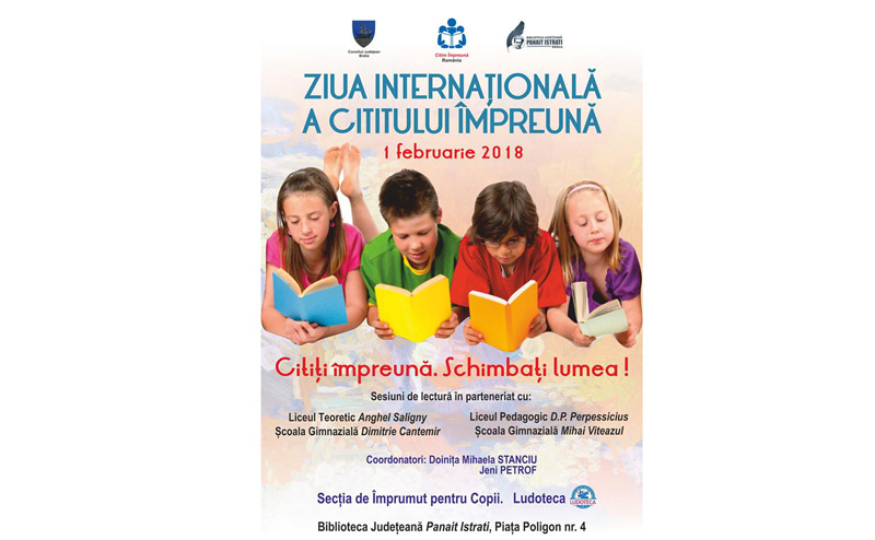 Joi, 1 februarie 2018, Biblioteca Judeţeană „Panait Istrati” Brăila celebrează “Ziua Internaţională a Cititului Împreună” (ZICI), eveniment global marcat de milioane de oameni în peste 100 de ţări, organizat de către Lit World. Apelul lansat de Asociaţia „Citim Împreună România” (CIR), iniţiatoarea proiectului, a atras anul acesta peste 500 de parteneri, care vor organiza sesiuni de lectură împreună cu mii de copii şi sute de educatori, învăţători, profesori, bibliotecari, librari şi pasionaţi de lectură din întreaga ţară.