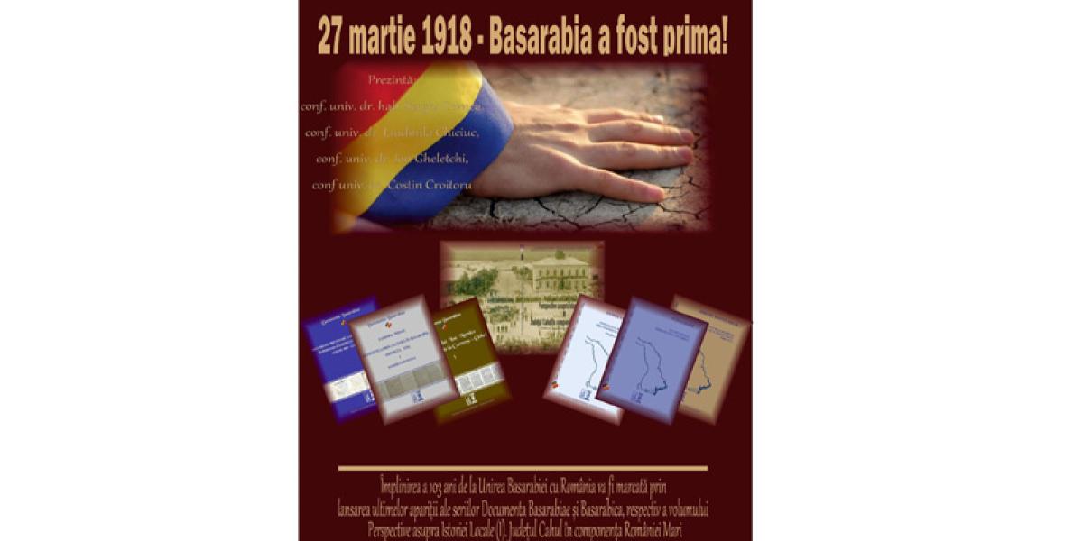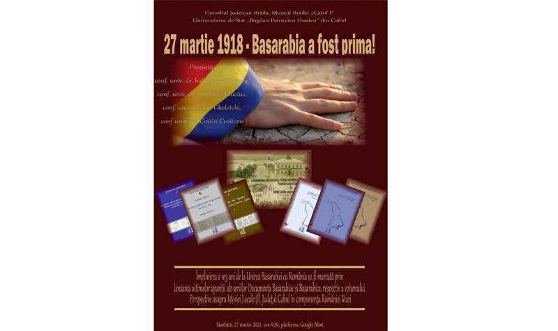 La 103 ani de la Unirea Basarabiei cu România sâmbătă, 27 martie 2021, de la ora 9.30, online pe platforma Google Meet, evenimentul va fi marcat prin lansarea ultimelor apariții ale seriilor „Documenta Basarabiae" și „Basarabica" ale Editurii „Istros" a Muzeului Brăilei „Carol I", respectiv a volumului „Perspective asupra Istoriei Locale (I). Județul Cahul în componența României Mari”. Manifestarea va fi prezentată de conf. univ. dr. Sergiu Cornea, conf. univ. dr. Liudmila Chiciuc, conf. univ. dr. Ion Ghelețchi, conf. univ. dr. Costin Croitoru.