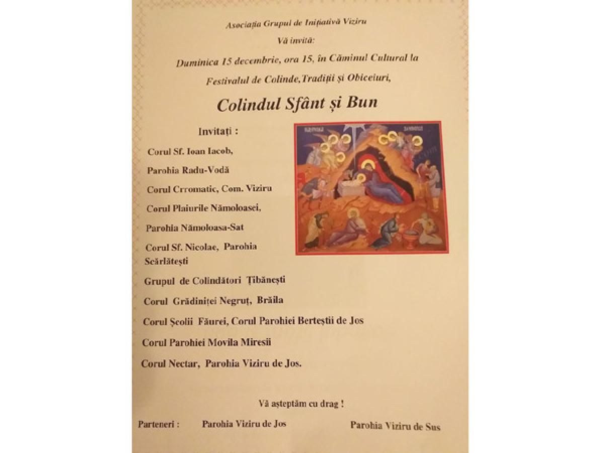 Asociaţia Grupul de Iniţiativă Viziru, ONG înfiinţat anul acesta, în parteneriat cu parohia Viziru de Jos şi parohia Viziru de Sus, organizează în ziua de duminică, 15 decembrie 2019, începând cu ora 15.00, Festivalul de colinde, tradiţii şi obiceiuri româneşti “Colindul Sfânt şi Bun”, la care sunt invitate să evolueze nu mai puţin de 11 coruri de copii din judeţele Brăila şi Galaţi. Vor fi prezenţi localnici din Viziru şi din alte localităţi ale judeţului, oficialităţi locale dar şi reprezentanţi ai unor ONG-uri brăilene.
