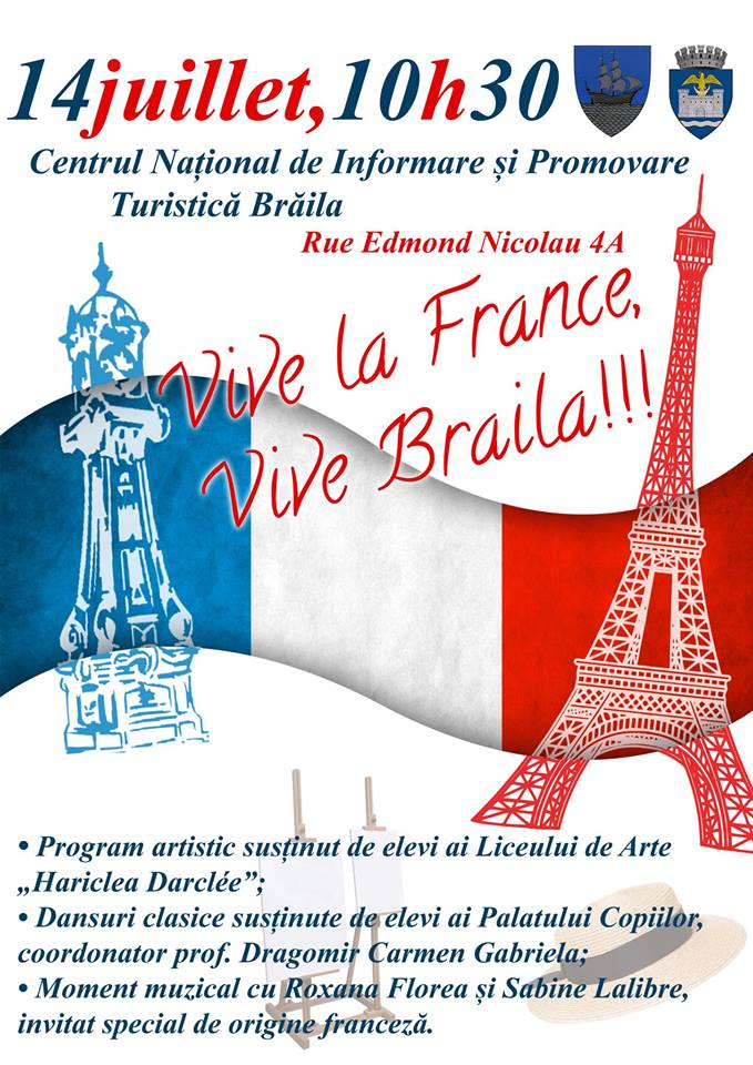 Sâmbătă, 14 iulie 2018, începând cu orele 10.30, în fața Centrului Național de Informare și Promovare Turistică Brăila vor avea loc o serie de manifestări dedicate Zilei Naționale a Franței. Evenimentul este organizat de Primăria Municipiului Brăila și debutează cu elevi ai Liceului de Arte “Hariclea Darclee”, care vor recita poezii și vor cânta în limba franceză.