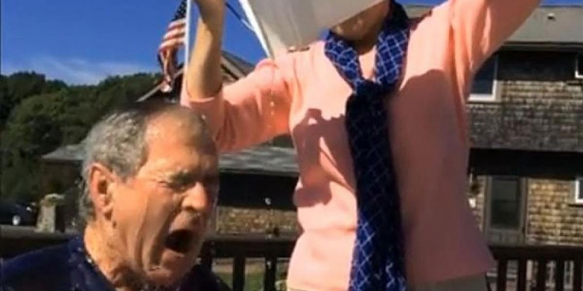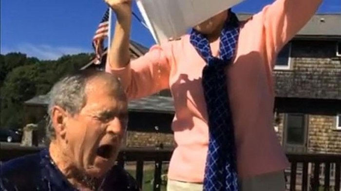 Într-un clip postat pe internet, George W. Bush declară, cu un aer sobru, că nu crede că duşul cu apă îngheţată este un gest indicat pentru un preşedinte şi că, prin urmare, va completa un cec pentru fundaţia ALS. În acel moment apare însă doamna Bush care aruncă pe el apa rece dintr-o găleată. „Acest cec este pentru mine. Nu mi-aş distruge coafura", comentează ea, atingându-şi cochet o şuviţă de păr. „Ieri a fost ziua de naştere a lui Billl (Clinton), iar cadoul meu pentru el este o găleată cu apă rece", spune, în final, George W.Bush, predând astfel ştafeta celui care i-a urmat la preşedinţia SUA.