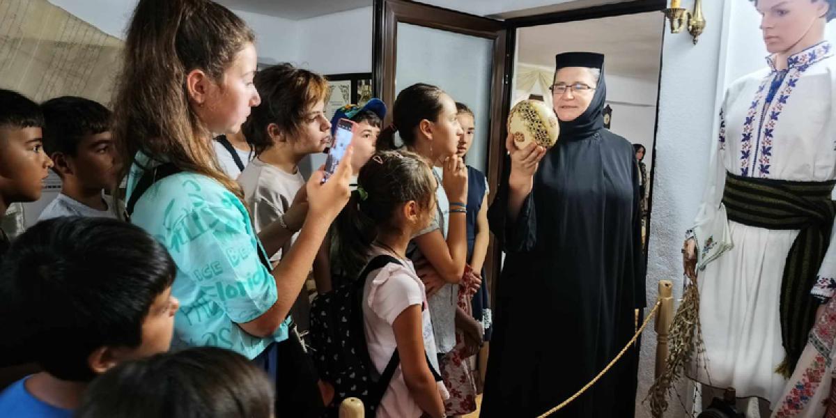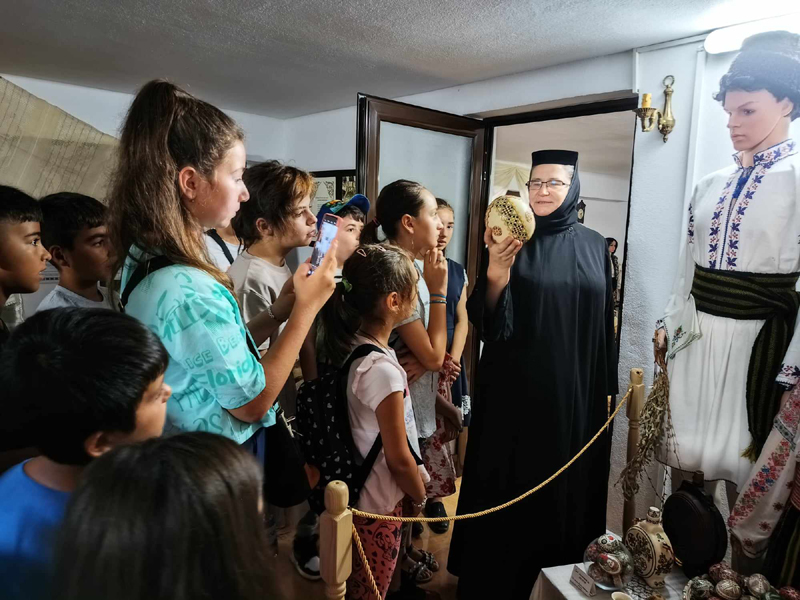 • le-a fost ghid maica Iustina, care le-a prezentat muzeul etnografic din incinta ansamblului mănăstiresc • la finalul zilei, copiii s-au bucurat de o agapă pregătită de darnicile monahii de la Lacu Sărat • activitatea face parte din Programul eparhial „Vacanța din pridvorul Bisericii”, desfășurat în fiecare an, cu binecuvântarea Înaltpreasfințitului Părinte Casian