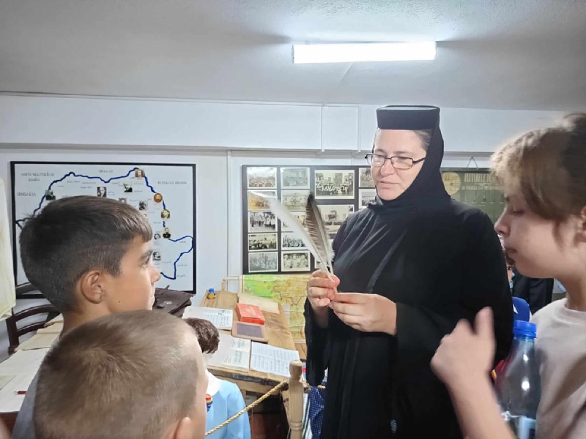 „Monahia le-a fost ghid vizitatorilor, prezentându-le exponatele cuprinse în colecția de obiecte autentice populare româneşti, mobilier, ceramică, obiecte de uz casnic, ţesături de interior, costume tradiţionale, meşteşuguri, dar și accesorii şcolare semnificative din istoria învăţământului românesc. În continuare, au fost desfășurate mai multe activități adecvate zilelor de vacanță în parcul din vecinătatea mănăstirii, iar la final toţi s-au bucurat de o agapă pregătită cu mult drag de darnicile monahii de la Mănăstirea „Sf. M. M. Pantelimon” Lacu Sărat”, a mai precizat pr. Rareş Bucur.