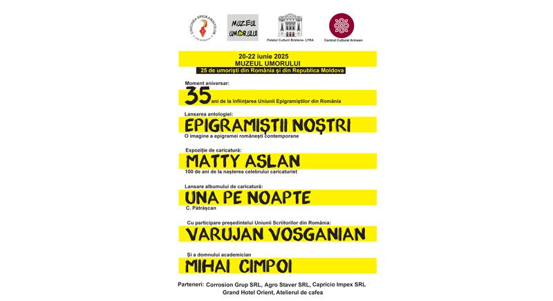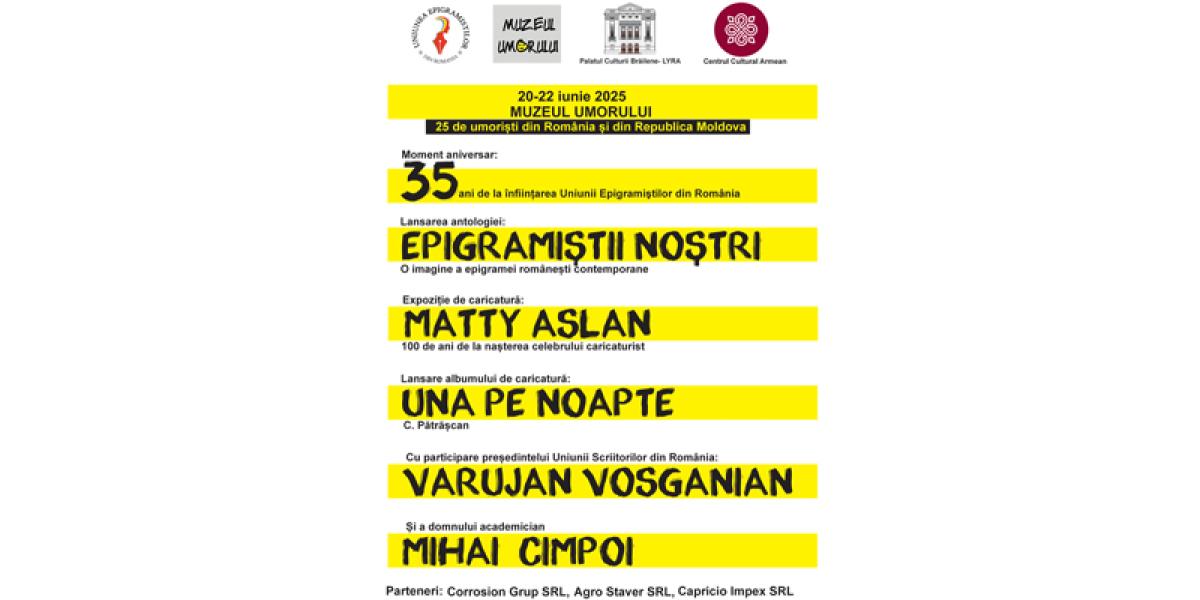 Astfel, sâmbătă, 21 iunie, Muzeul Umorului din Brăila (de la Palatul Culturii Brăilene Lyra) găzduiește un eveniment cultural de excepție, dedicat aniversării a 35 de ani de la înființarea Uniunii Epigramiștilor din România. Evenimentul se va bucura de participarea președintelui Uniunii Scriitorilor din România, Varujan Vosganian, precum și a academicianului Mihai Cimpoi.