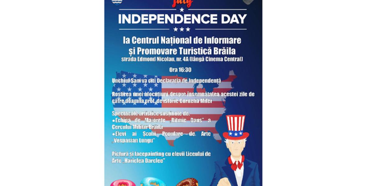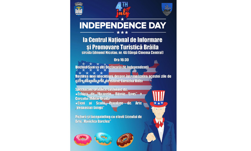 Miercuri, 4 iulie 2018, începând cu ora 16.30, la Centrul Naţional de Informare şi Promovare Turistică Brăila, situat pe strada Edmond Nicolau nr. 44 - lângă Cinema Central, vor avea loc mai multe activităţi dedicate Zilei Statelor Unite ale Americii.