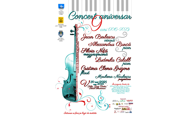 Filarmonica „Lyra - George Cavadia” Brăila sărbătorește 9 ani de muzică și emoție printr-un concert aniversar ce va avea loc vineri, 30 mai, de la ora 11:00, în Sala „Dan Dediu” (sediul Filarmonicii). Va fi un eveniment de excepție la care își vor da concursul artiști de renume: violonistul Jean Berlescu, pianistul Alexandru Burcă, mezzosoprana Silvia Niță, pianista Ludmila Calalb și flautista Cristina Elena Grigore.