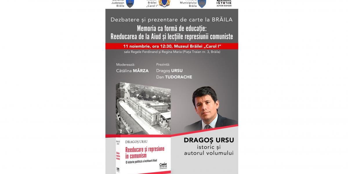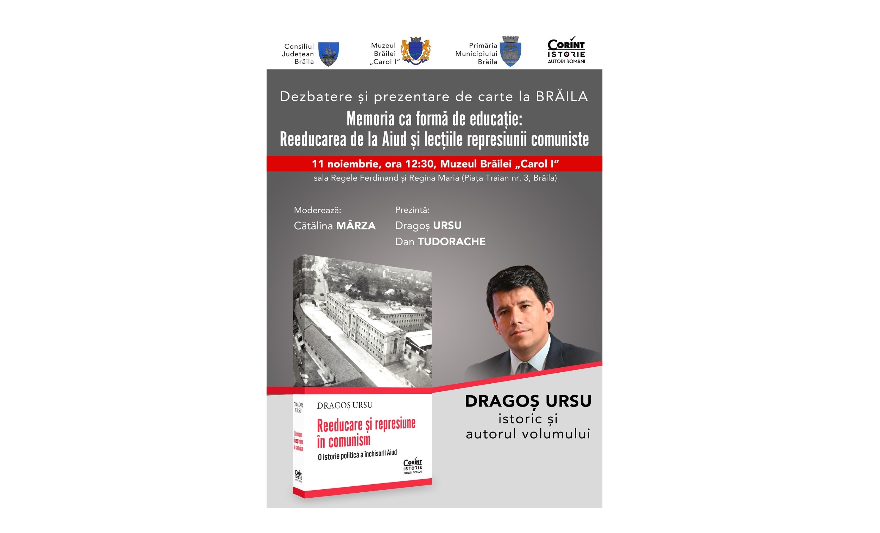Muzeul Brăilei „Carol I” invită publicul marți, 11 noiembrie, la un eveniment editorial de o mare importanță pentru înțelegerea istoriei recente a României. În sala „Regele Ferdinand și Regina Maria”, începând cu ora 12:30, va avea loc lansarea volumului „Reeducare și represiune în comunism/ O istorie politică a închisorii Aiud”, semnat de istoricul Dragoș Ursu. Cartea, apărută la Editura Corint în anul 2024, analizează în detaliu una dintre cele mai întunecate perioade din istoria sistemului penitenciar românesc.