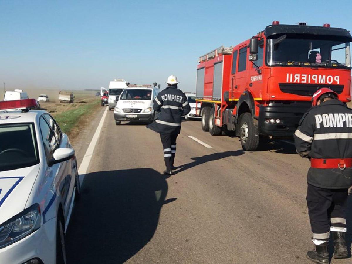 Imediat cum accidentul a fost anunţat, la faţa locului s-au deplasat trei ambulanţe ale Serviciului de Ambulanţă Judeţean, două ambulanţe SMURD, Descarcerarea, dar şi două autospeciale de stingere cu apă şi spumă.