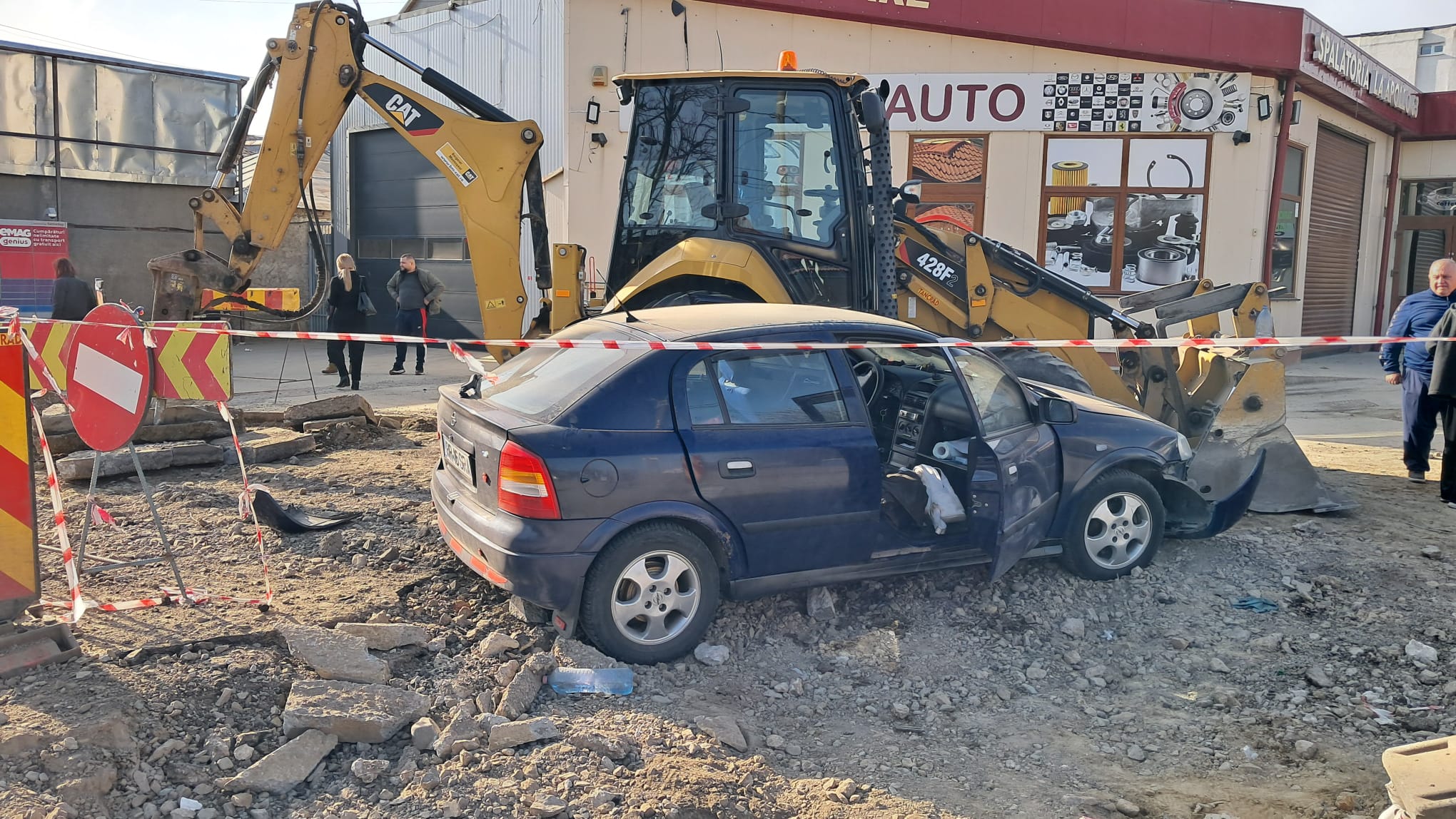 * în zona unde se efectuează lucrări, acesta a trecut printre balizele de semnalizare, lovind molozul și un utilaj parcat * șoferul susține că mașina sa ar fi rămas fără frâne * în urma evenimentului a rezultat vătămarea corporală a unei pasagere în autoturism, o femeie de 56 de ani