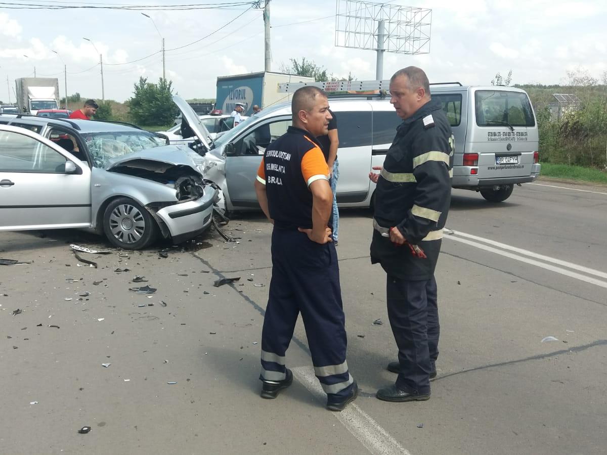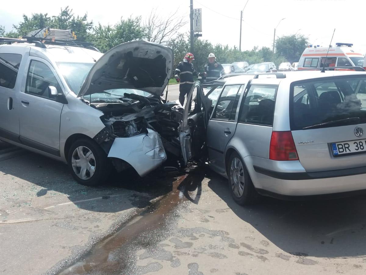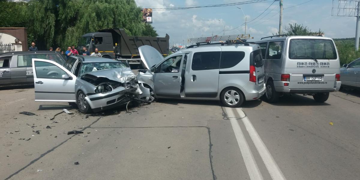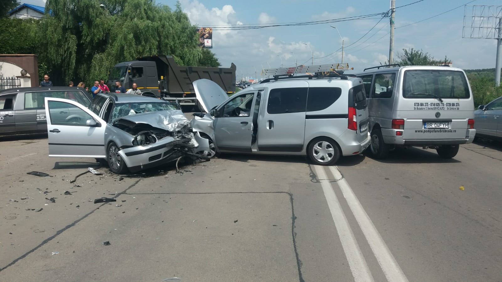 Accident cu trei autoturisme implicate, pe DN 22 B - Dig Brăila - Galați, chiar la ieșire din Brăila. Din primele date, se pare că un autoturism tip dubiță, de la o firmă de pompe funebre, care circula dinspre Brăila spre Galați, a oprit pentru a vira la stânga. În acel moment, un alt auto Dacia Dokker, aflat în spatele său, care nu a păstrat distanța corespunzătoare în mers, a lovit-o în partea laterală stânga. Autoturismul Dacia a intrat apoi în coliziune cu un al treilea vehicul, marca Volkswagen, care circula din sens opus. În urma coliziunii au rezultat 4 victime, dintre care 3 adulți și un copil, care au fost transportate la spital pentru îngrijiri medicale. Circulația este blocată pe ambele sensuri.