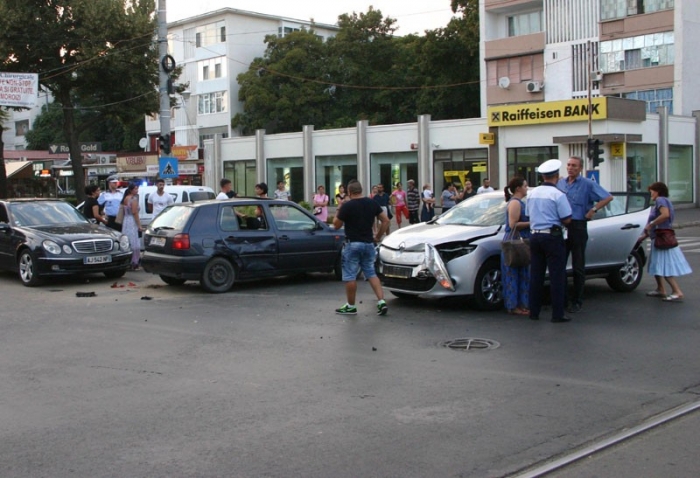 La intersecţie, ştiind că are prioritate, acesta a intrat în plin în Volkswagen, pe care l-a aruncat pe contrasens, direct într-un Mercedes ce venea tot pe 1 Decembrie dinspre Piaţa Mare către Dunărea.