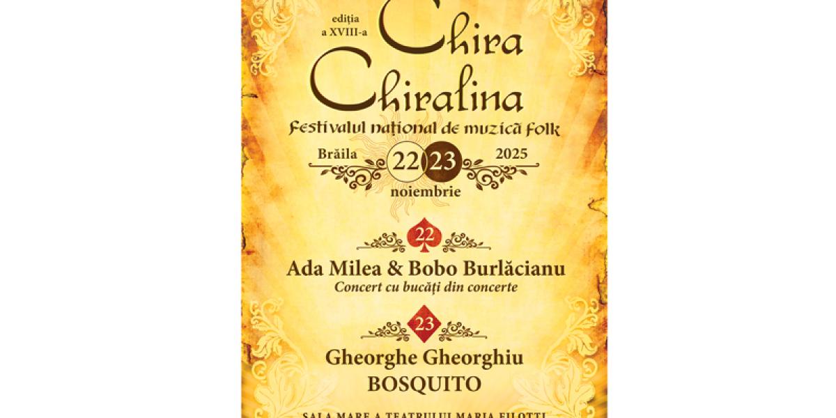 Centrul Județean pentru Conservarea și Promovarea Culturii Tradiționale (Centrul de Creație) Brăila, alături de Consiliul Județean și Primăria Municipiului Brăila organizează, în incinta Teatrului „Maria Filotti”, în zilele de 22 și 23 noiembrie, organizează cea de-a XVIII-a ediție a Festivalului Național de Muzică Folk „Chira Chiralina”, care va transforma Brăila în capitală a muzicii folk și care va delecta publicul cu o gală de recitaluri susținute de artiști renumiți. Biletele la eveniment sunt epuizate de câteva zile, semn că folkul se menține în preferințele brăilenilor.