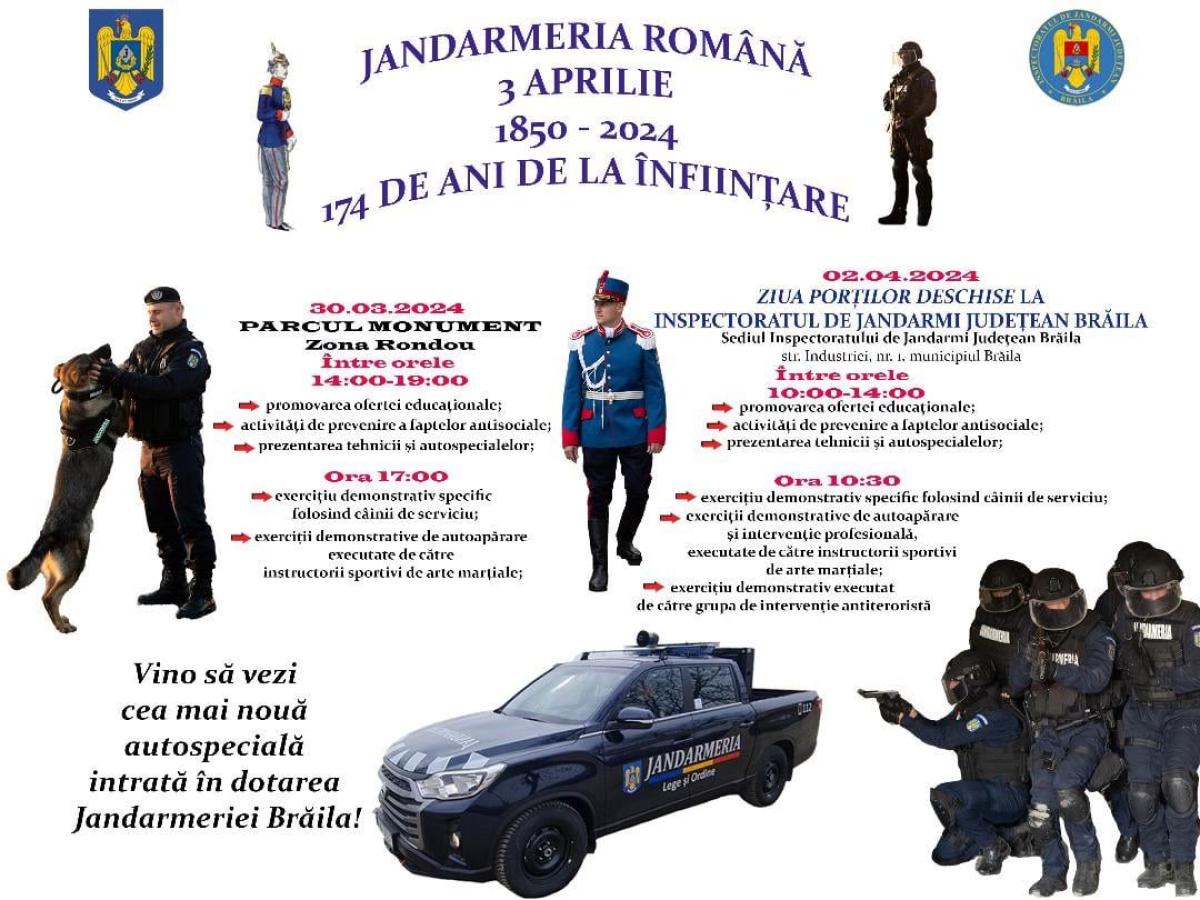 Pentru aniversarea a 174 de ani de la momentul istoric al acordării statutului juridic Jandarmeriei Române (03 aprilie 1850) de către domnitorul Grigore Alexandru Ghica, Inspectoratul de Jandarmi Județean Brăila a pregătit mai multe activități preventiv-educative și de informare. Activitățile dedicate Zilei Jandarmeriei Române debutează sâmbătă, 30 martie, în Parcul Monument – zona Rondou, între orele 14:00 și 19:00, după cum au transmis reprezentanţii instituţiei. „Elementul de noutate al acestei aniversări este cea mai nouă autospecială intrată în dotarea Jandarmeriei Brăila menită să intervină în situații de urgență sau calamități naturale. Vor fi prezenți colegi din cadrul Biroului Resurse Umane, compartimentului Prevenirea și Combaterea Faptelor Antisociale, Detașamentului 1 Jandarmi Mobil și 2 dintre câinii de serviciu ai Jandarmeriei Brăila, Lord și Fedor. Începând cu ora 17:00, tot în zona Rondou din Parcul Monument, se vor desfășura exerciții de disciplinizare a câinilor de serviciu și de prindere a unui infractor, dar și de autoapărare”, au precizat jandarmii.