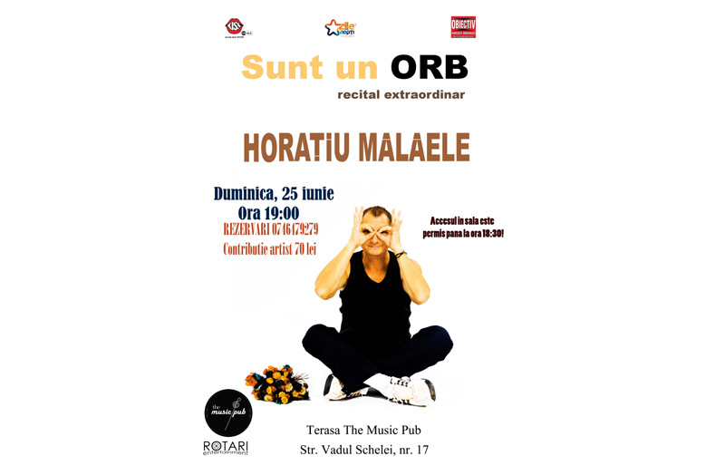 • evenimentul este programat pe 25 iunie (duminică), la ora 19:00, pe terasa The Music Pub (lângă Patinoar) • atenţie, accesul în incinta terasei se va face până cel târziu la ora 18:30 • spectacolul “Sunt un orb” s-a născut din nevoia lui Horaţiu Mălăele de a comunica poeziile pe care le-a memorat până în prezent