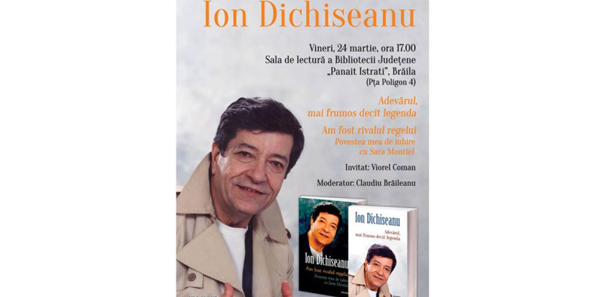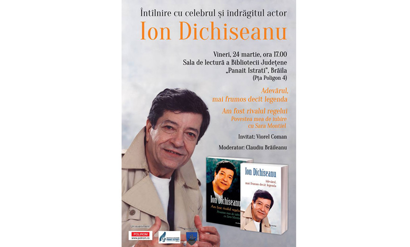 Astăzi, de la ora 17.00, la Sala de lectură a Bibliotecii Judeţene “Panait Istrati” din Brăila va avea loc o întâlnire cu celebrul şi îndrăgitul actor Ion Dichiseanu, cu prilejul lansării volumelor “Am fost rivalul regelui. Povestea mea de iubire cu Sara Montiel” şi “Adevărul, mai frumos decât legenda”, ambele apărute la Editura Polirom.