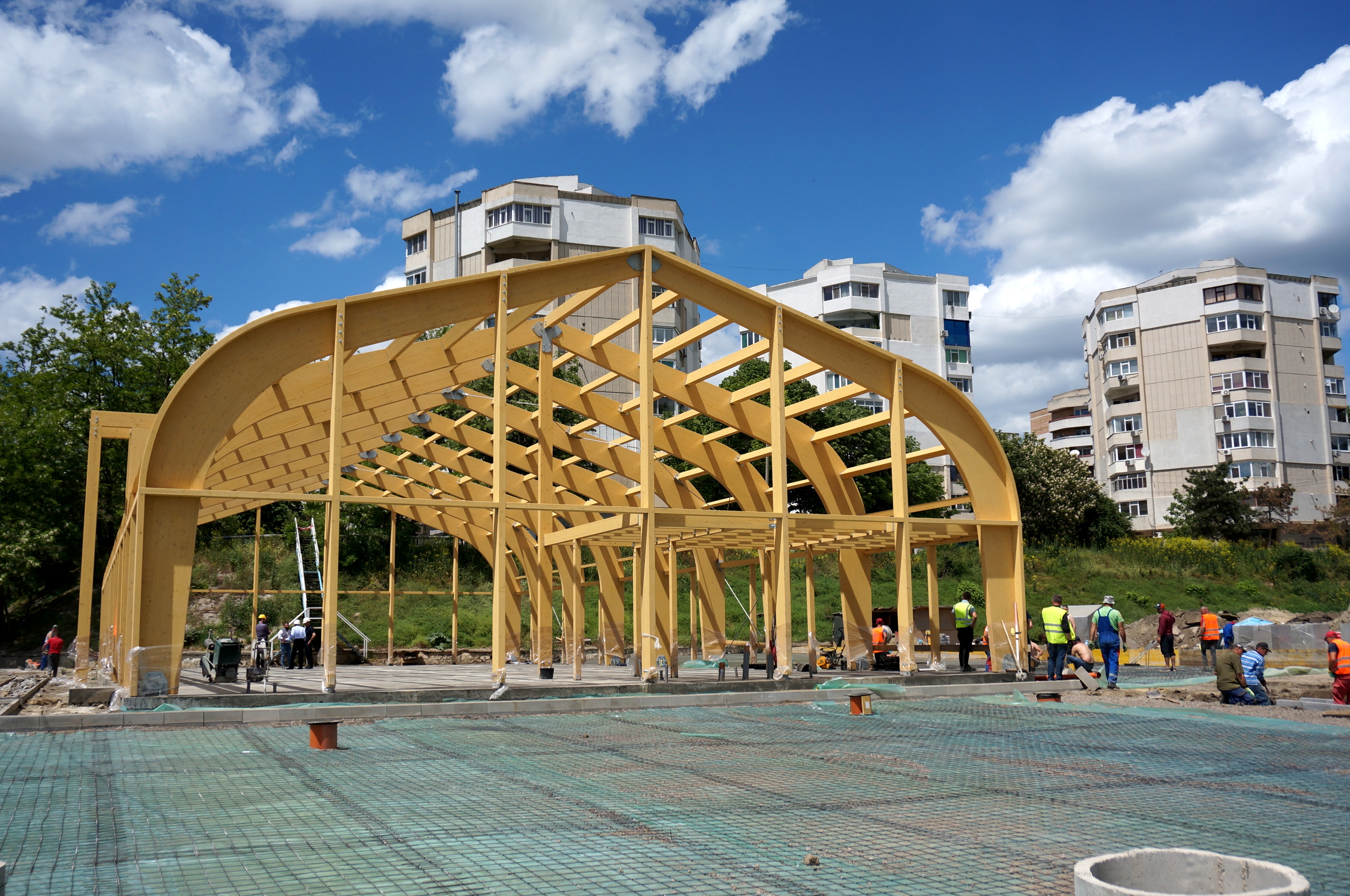 * structura din lemn a construcției a fost pusă pe poziție și impresionează printr-un aspect modern și deosebit * din câte se pare, tocmai aspectul acestor componente din lemn, care s-au dovedit foarte greu de realizat, a provocat depășirea termenului de execuție a construcției, ce ar fi trebuit să fie gata încă din data de 12 aprilie a.c.