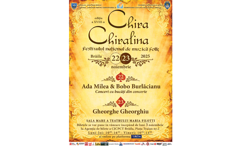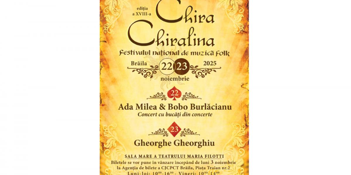 Pregătirile pentru cea de-a XVIII-a ediție a Festivalului Național de Muzică Folk „Chira Chiralina”, organizat de Consiliul Județean Brăila, prin Centrul Județean pentru Conservarea și Promovarea Culturii Tradiționale (Centrul de Creație) și Primăria Municipiului Brăila, în zilele de 22 și 23 noiembrie (sâmbătă și duminică) au intrat pe ultima sută de metri.
