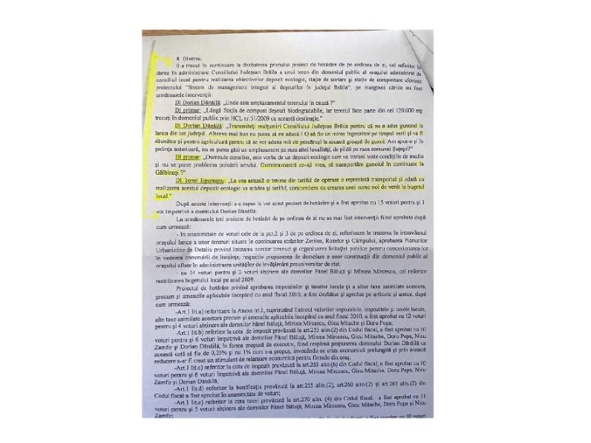 Sursa citată continuă: “Epureanu Ionel a declarat-mințit, în plină ședință de CL la vremea respectivă, că aprobarea proiectului privind trecerea în administrarea Consiliului Județean Brăila a terenului în suprafață de 77.500 mp, pe care se va amenaja depozitul ecologic, va fi în beneficiul locuitorilor din Ianca, prin faptul că prețul la gunoi va scădea cu 30%. "La ora actuală o treime din tariful de operare o reprezintă transportul și, odată cu realizarea acestui depozit ecologic, va scădea și tariful, concomitent cu crearea unei surse noi de venit la bugetul local" – este declarația viceprimarului Epureanu, conform procesului-verbal al ședinței CL din 29.10.2009 (foto).