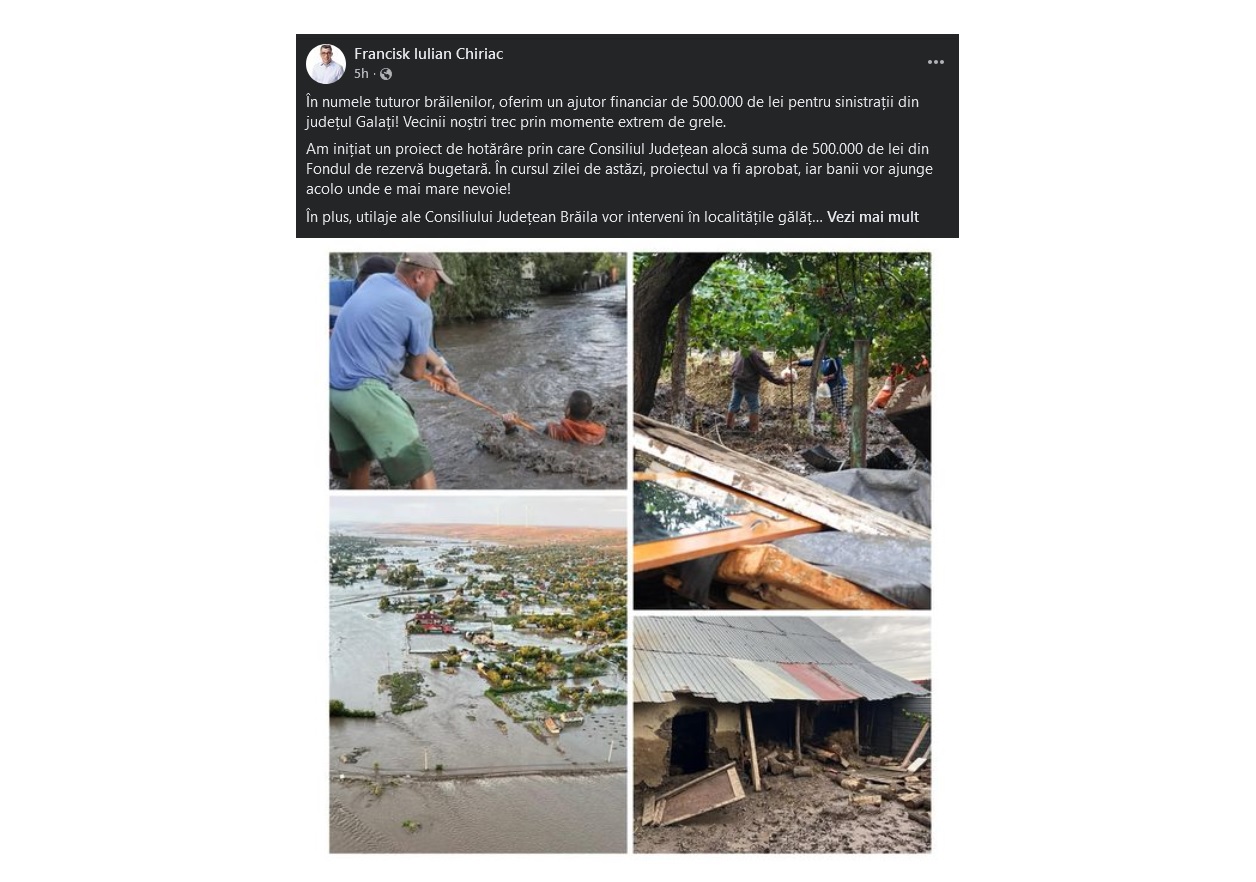 ”În numele tuturor brăilenilor, oferim un ajutor financiar de 500.000 de lei pentru sinistrații din județul Galați! Vecinii noștri trec prin momente extrem de grele. Am inițiat un proiect de hotărâre prin care Consiliul Județean alocă suma de 500.000 de lei din Fondul de rezervă bugetară. În cursul zilei de astăzi (n.r. – joi), proiectul va fi aprobat, iar banii vor ajunge acolo unde e mai mare nevoie! În plus, utilaje ale Consiliului Județean Brăila vor interveni în localitățile gălățene afectate. Sunt mândru de modul în care brăilenii au reacționat și nu cred că există un exemplu mai solid de solidaritate și compasiune!”, a declarat Chiriac.