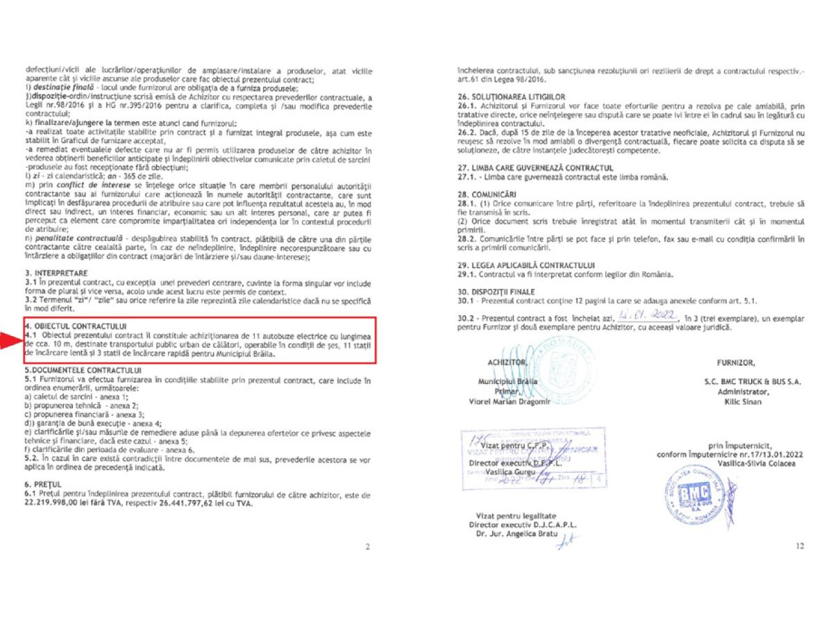 * primarul Marian Dragomir a anunțat, ieri, că a semnat contractul pentru achiziția a 11 autobuze electrice noi, 11 stații încărcare lentă și 3 stații încărcare rapidă la Brăila * acestea sunt cumpărate cu fonduri europene, în urma unei licitații organizate de Ministerul Dezvoltării pentru mai multe orașe din țară * valoarea contractului conform licitației este de 26.441.797 lei (5.508.707 euro), din care Primăria Municipiului Brăila cofinanțează 2% - 4.693.663 lei (977.846 euro) cu TVA * livrarea acestora se va face în 2023