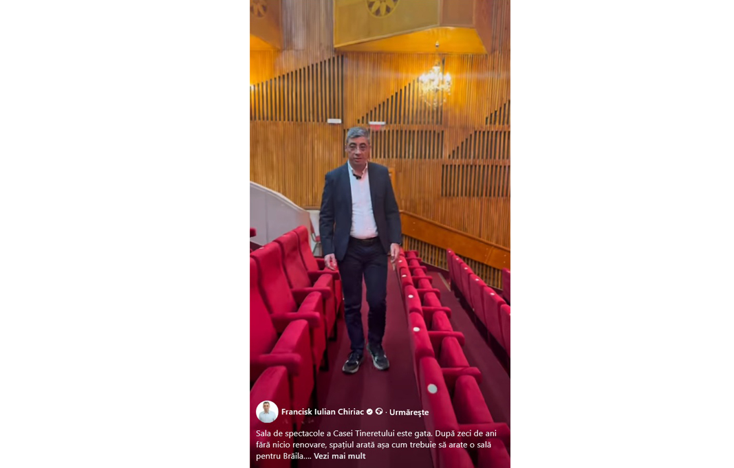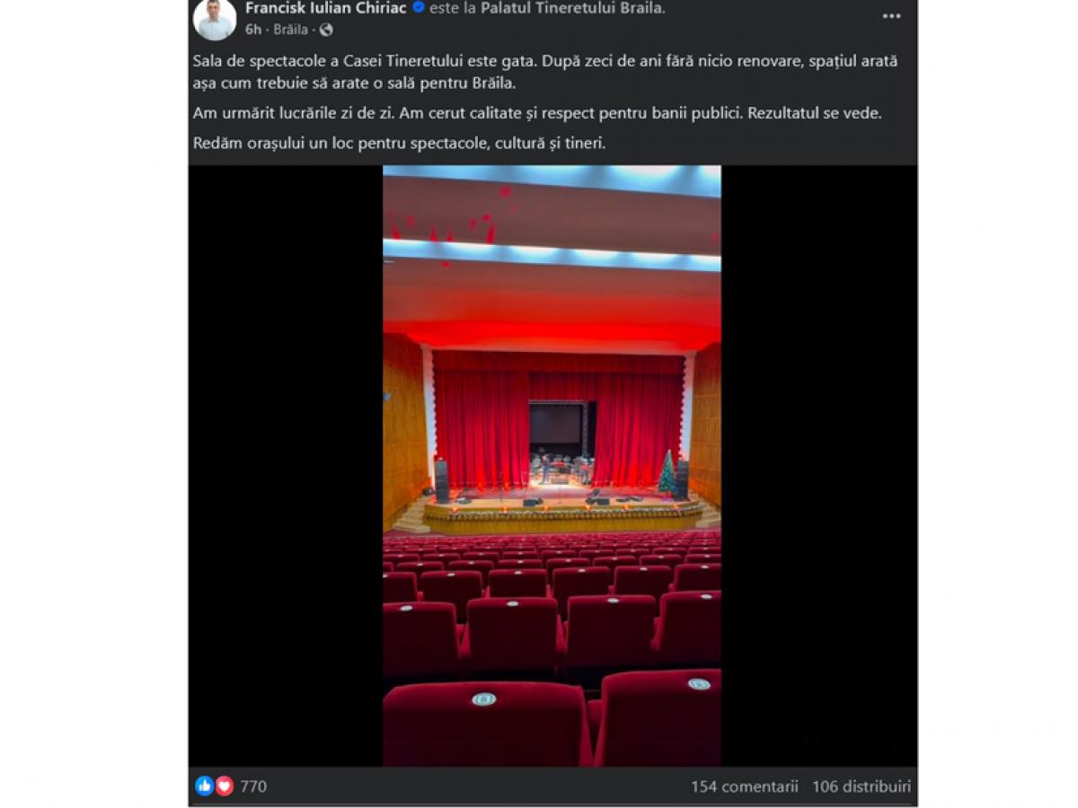 ”Sala de spectacole a Casei Tineretului este gata. După zeci de ani fără nicio renovare, spațiul arată așa cum trebuie să arate o sală pentru Brăila. Am urmărit lucrările zi de zi. Am cerut calitate și respect pentru banii publici. Rezultatul se vede. Redăm orașului un loc pentru spectacole, cultură și tineri”, a mai scris Chiriac pe Facebook.